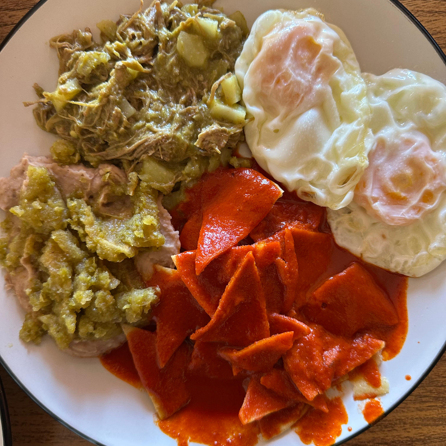Porción De Chilaquiles, Acompañados De 1 Huevo Al Gusto, 1 Guiso Al Gusto Y Frijoles