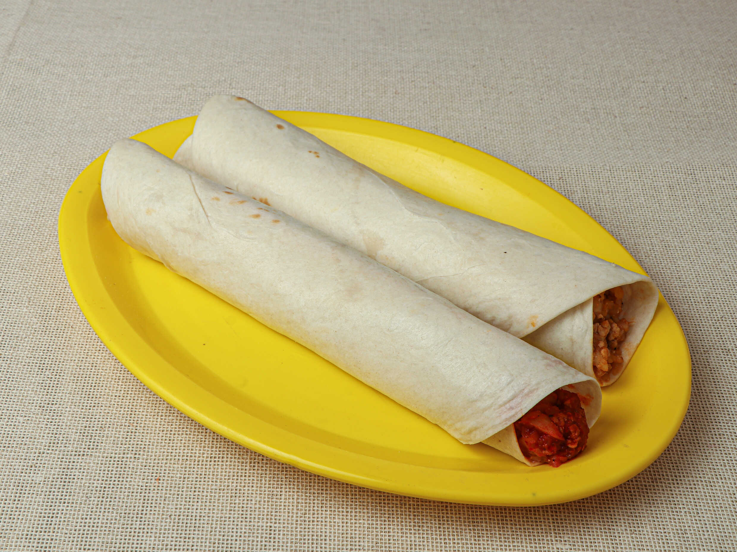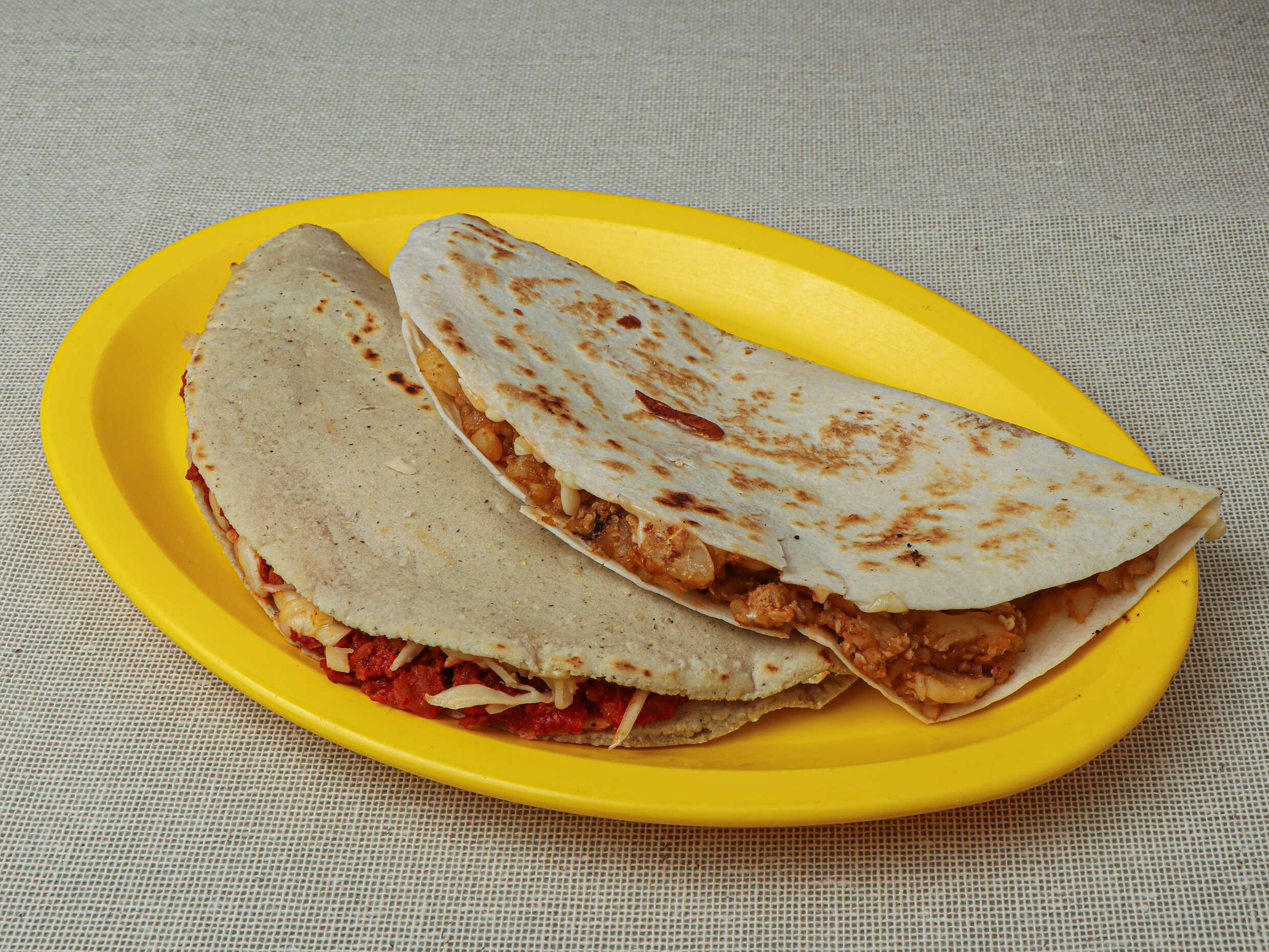 1 tortilla de harina o maíz, 15 gramos de queso exencio y un guiso a escoger.
