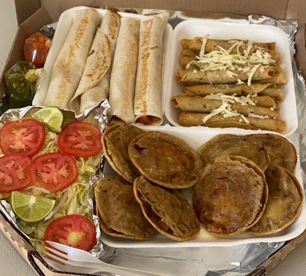 8 gorditas doradas, 12 taquitos dorados y 4 burros guiso a elegir