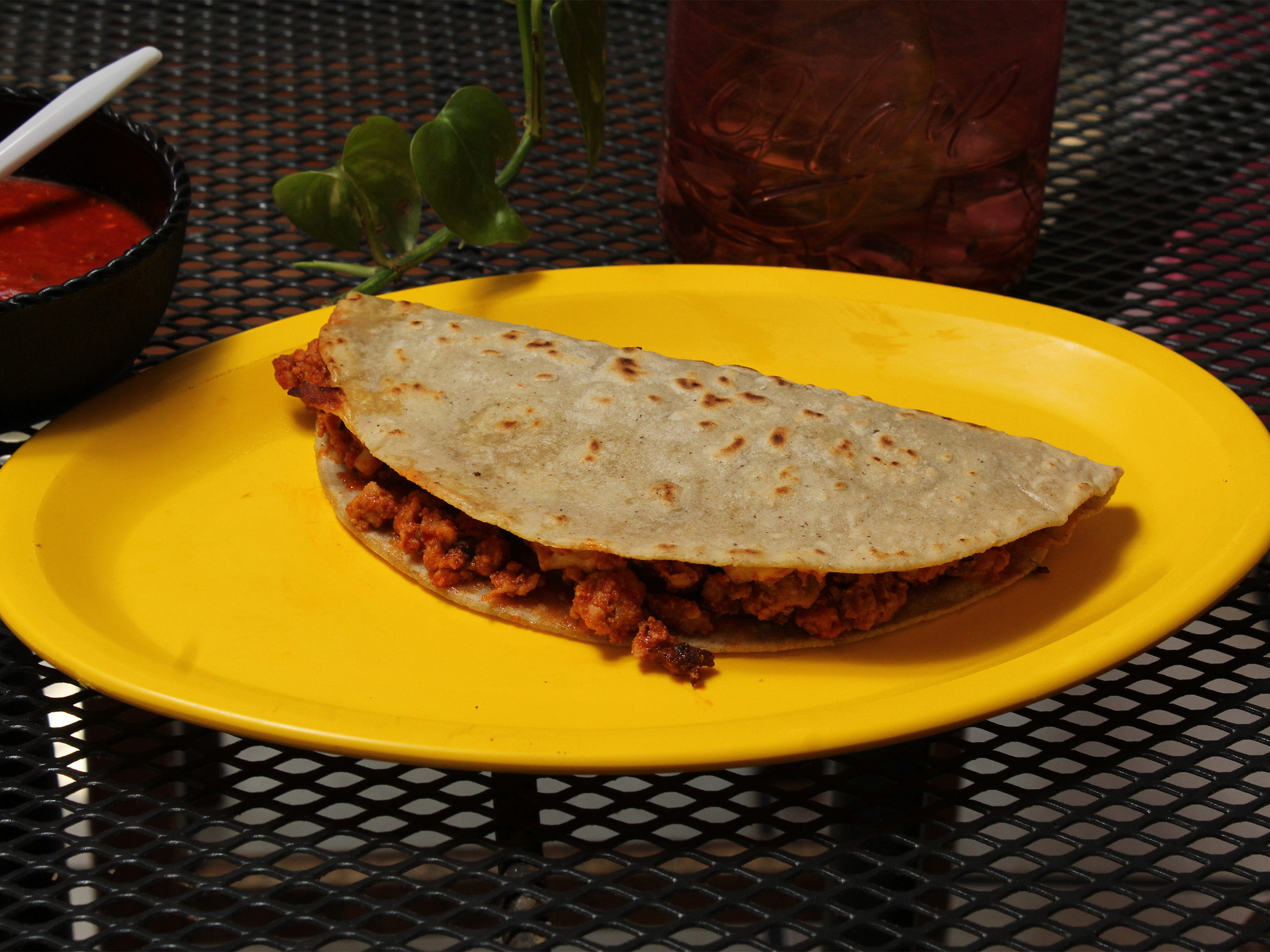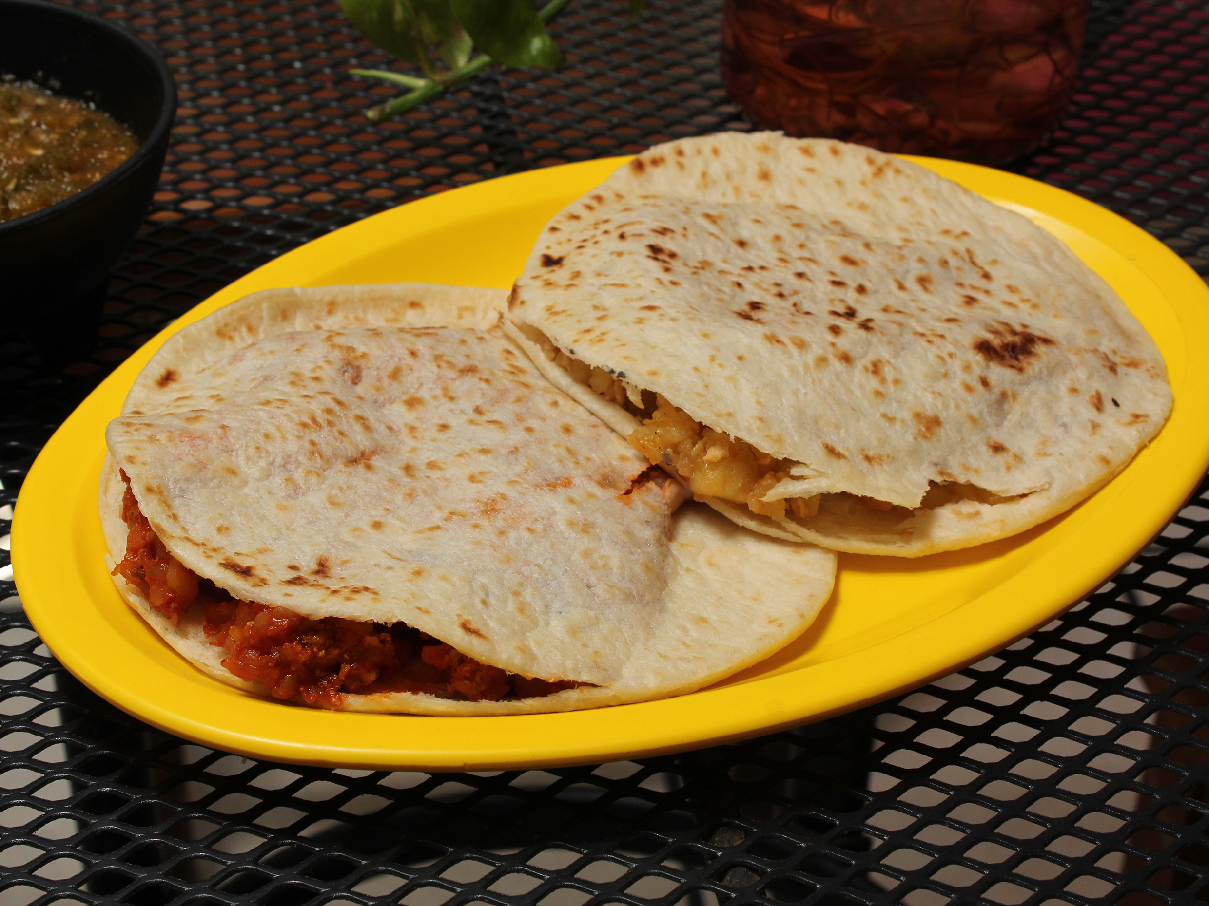 Con tortilla de harina o maíz, queso y un guiso a escoger.