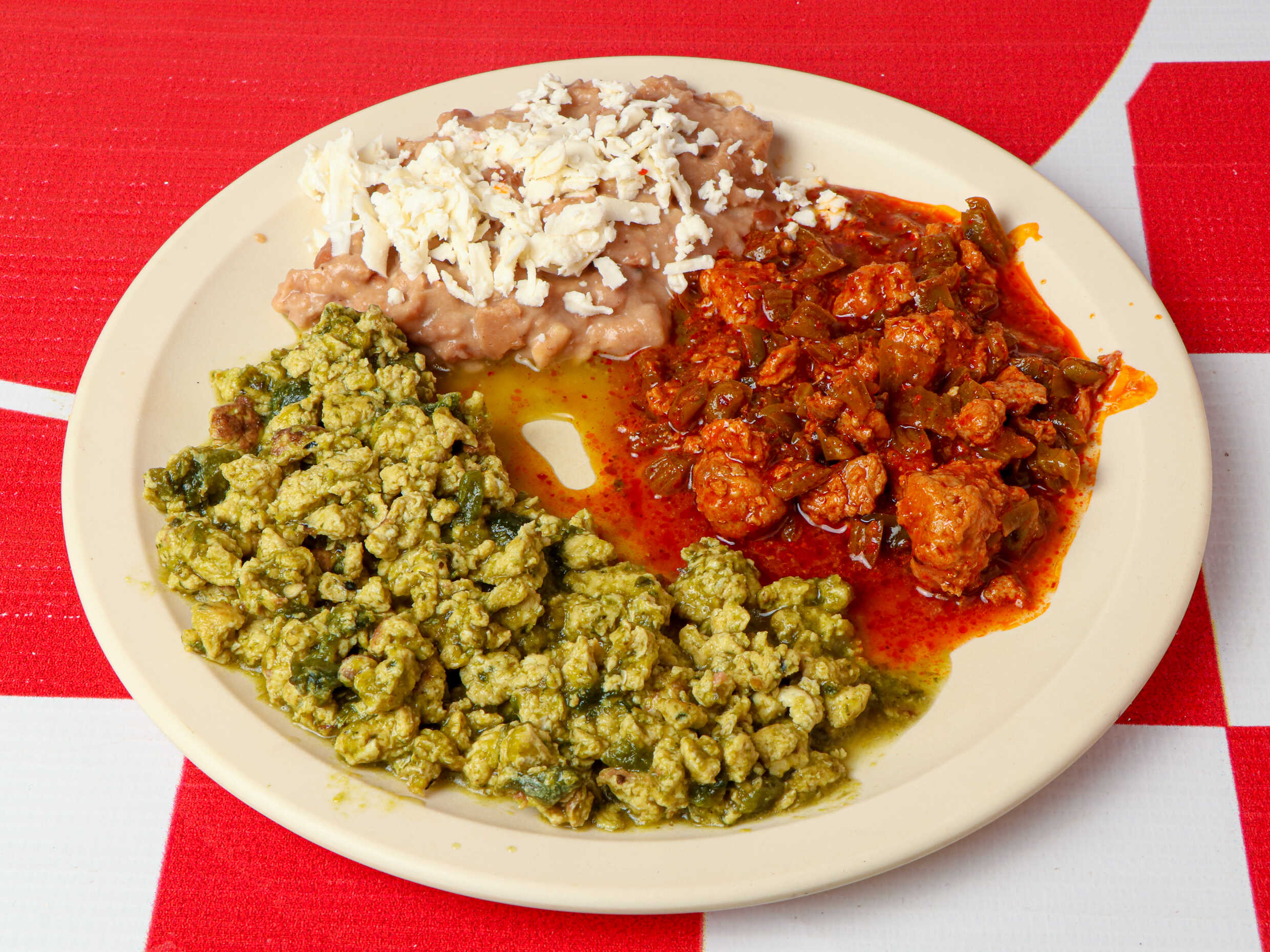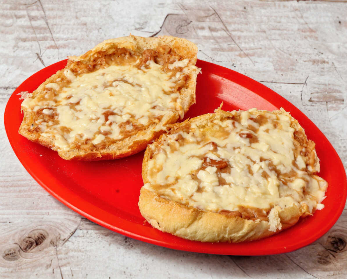 Frijoles, guiso a elegir y queso gratinado.