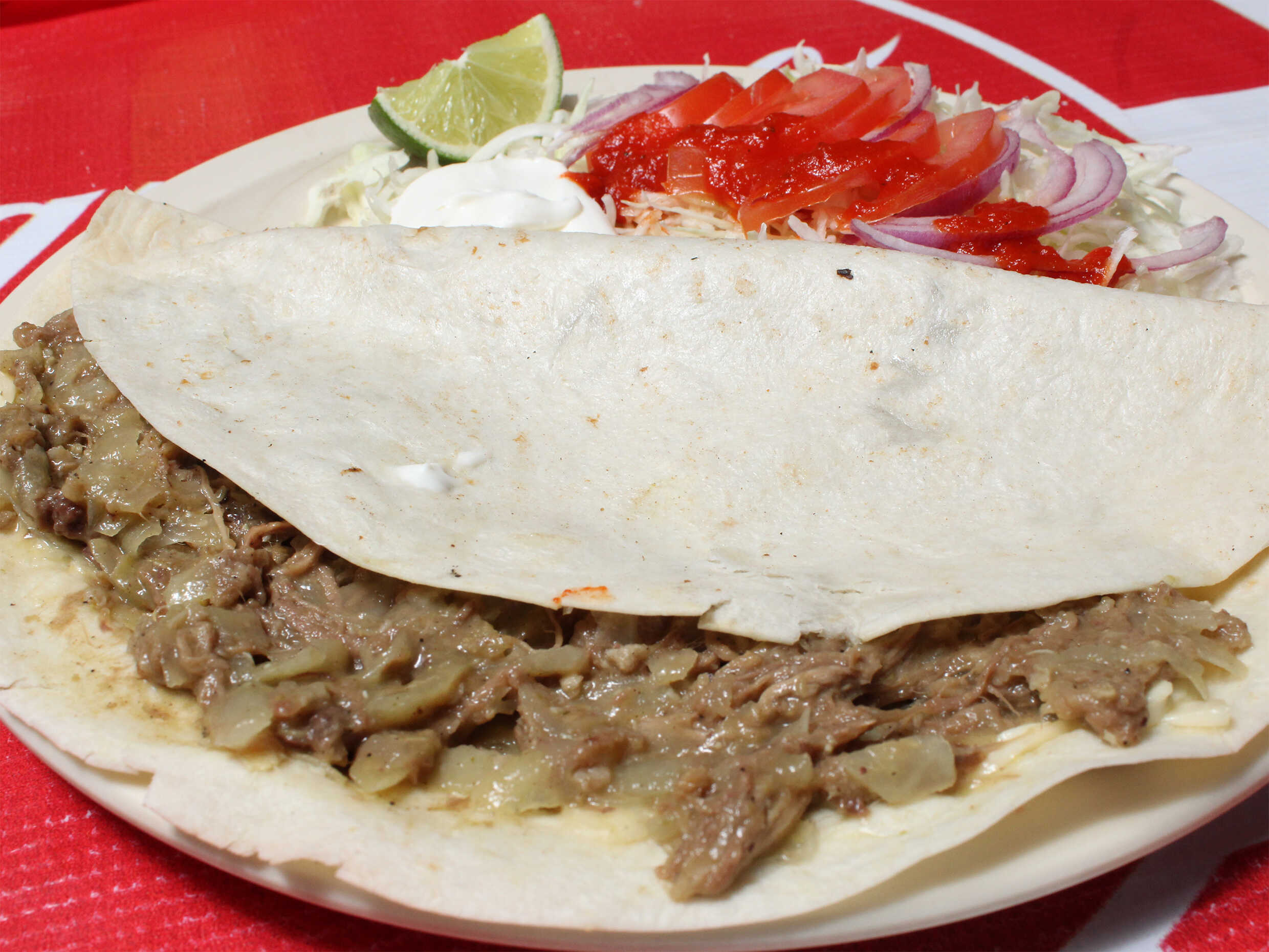 7 Tacos de maíz con carne deshebrada, ensalada con repollo, tómate, cebolla, limón y nuestra deliciosa salsa casera.
