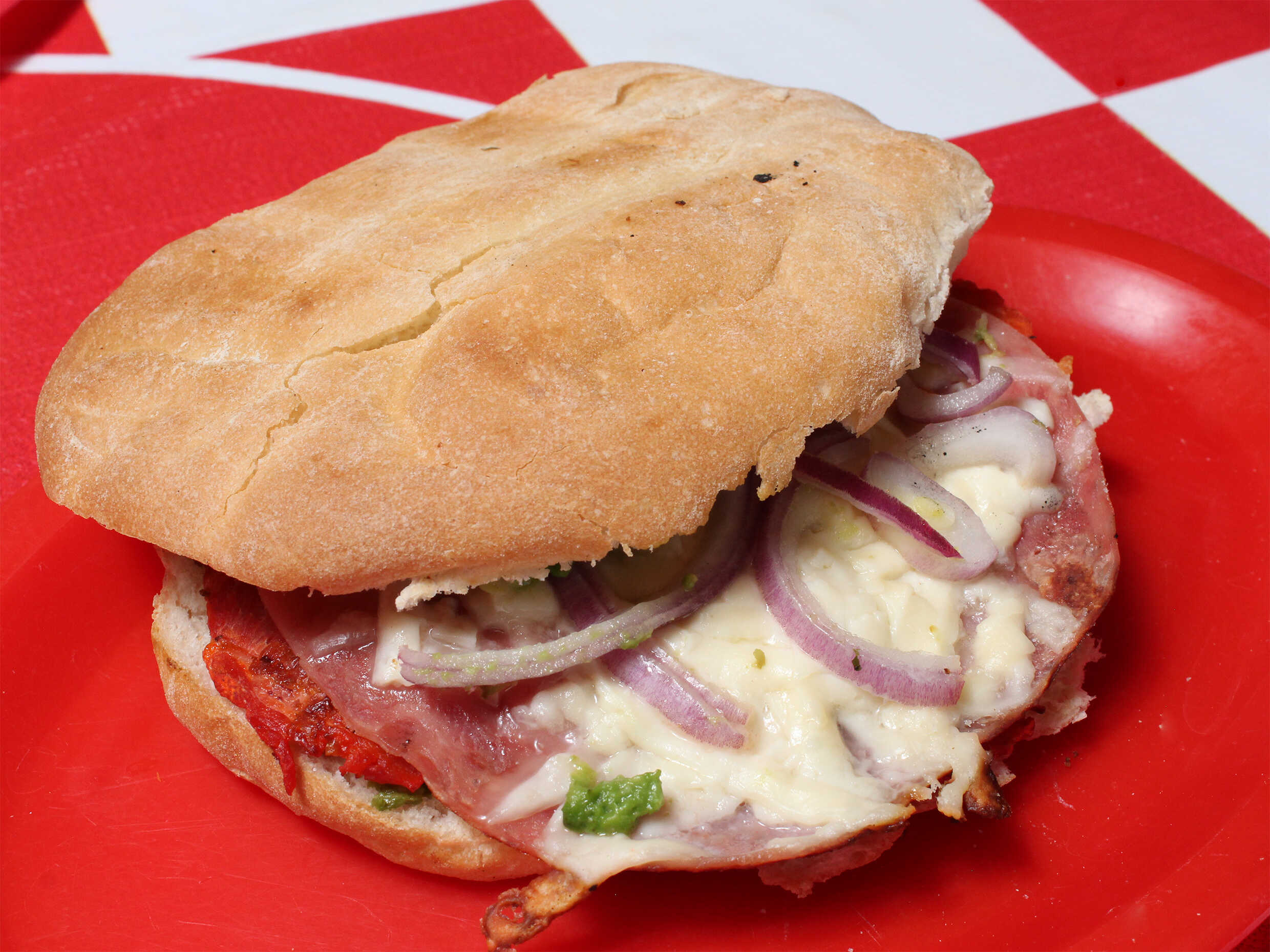 Totilla de harina, pierna, jamón, queso, aguacate, tomate, cebolla, chile curtido