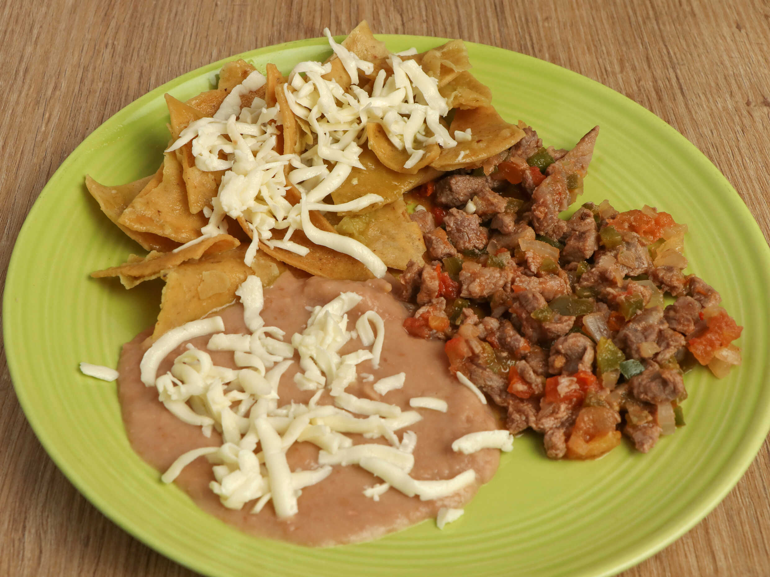 Incluye chilaquiles rojos o verdes, frijolitos refritos con chorizo y guiso
