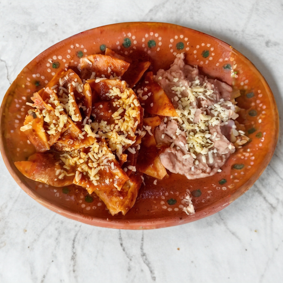 Chilaquiles rojos o verdes acompañados de frijoles.