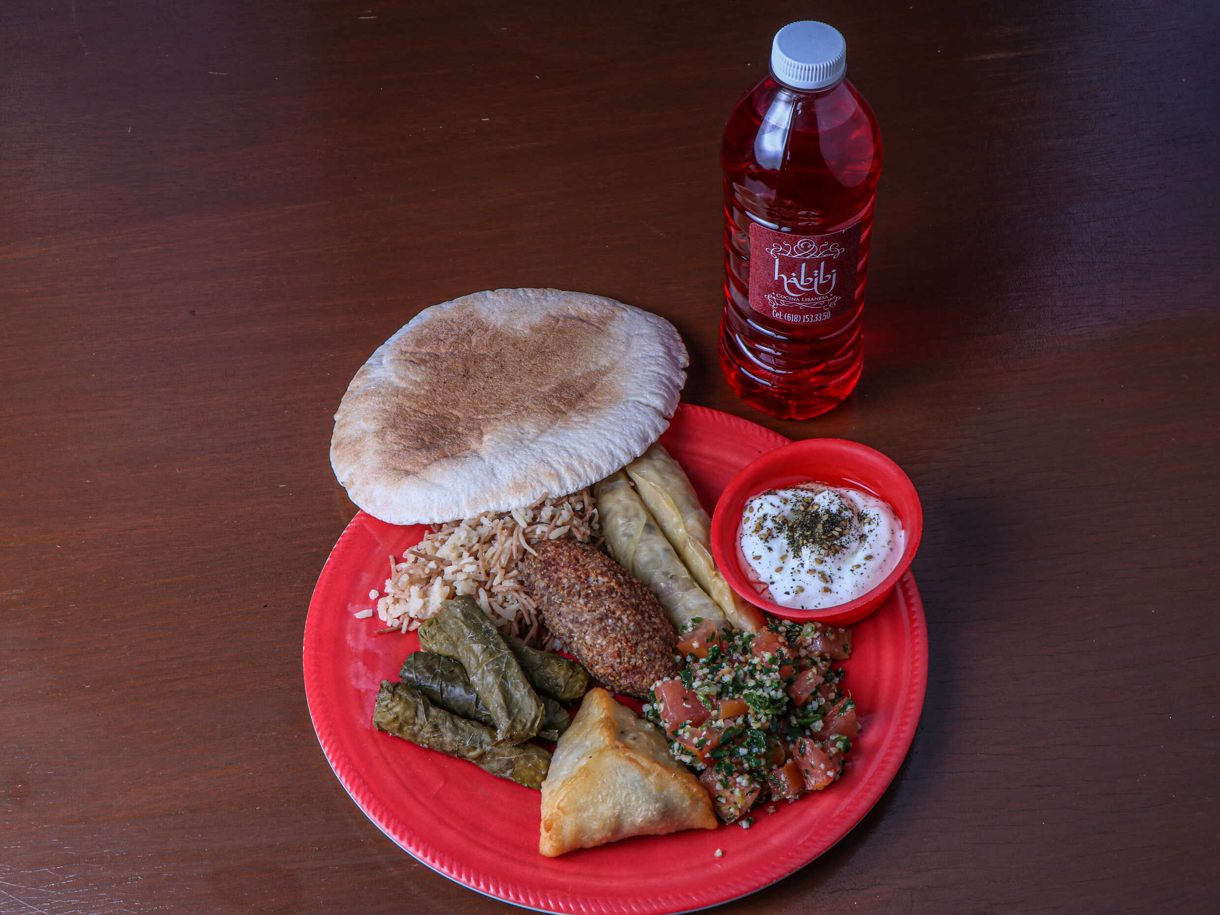 Arroz con Fideos 1/4*1 + Tacos de Col*1 + Kepe Bola*1 + Fatayer de Espinacas*1 + Tabule 1/4*1 + Jocoque 1/4*1 + Pan Árabe*1 + Agua Fresca*1 + 5 pzas de hoja de parra