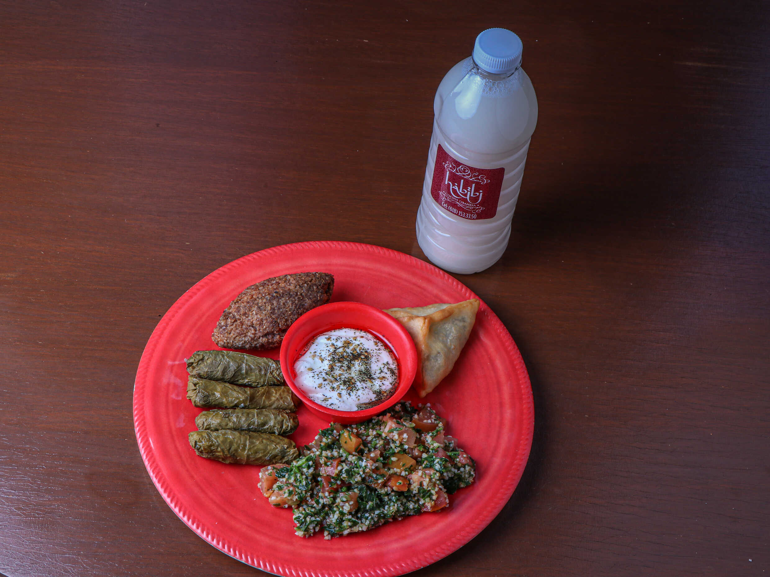 Tabule 1/4*1 + 4 Hojas de Parra*1 + Fatayer de Espinacas*1 + Kepe Bola*1 + Agua Fresca*1
