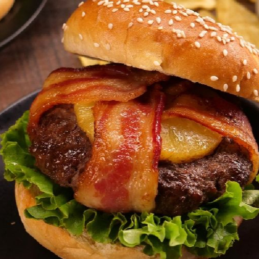 Pan, carne de res, queso amarillo, piña, tocino, salchicha para asar,verdura, chiles, aderezos.