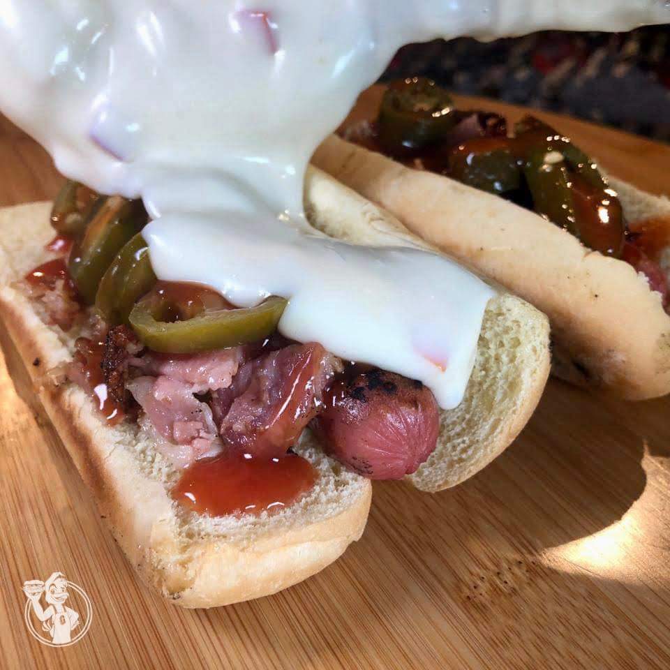 Salchicha, queso, tocino, chile, mayonesa o melambrea y pan para hot dog.