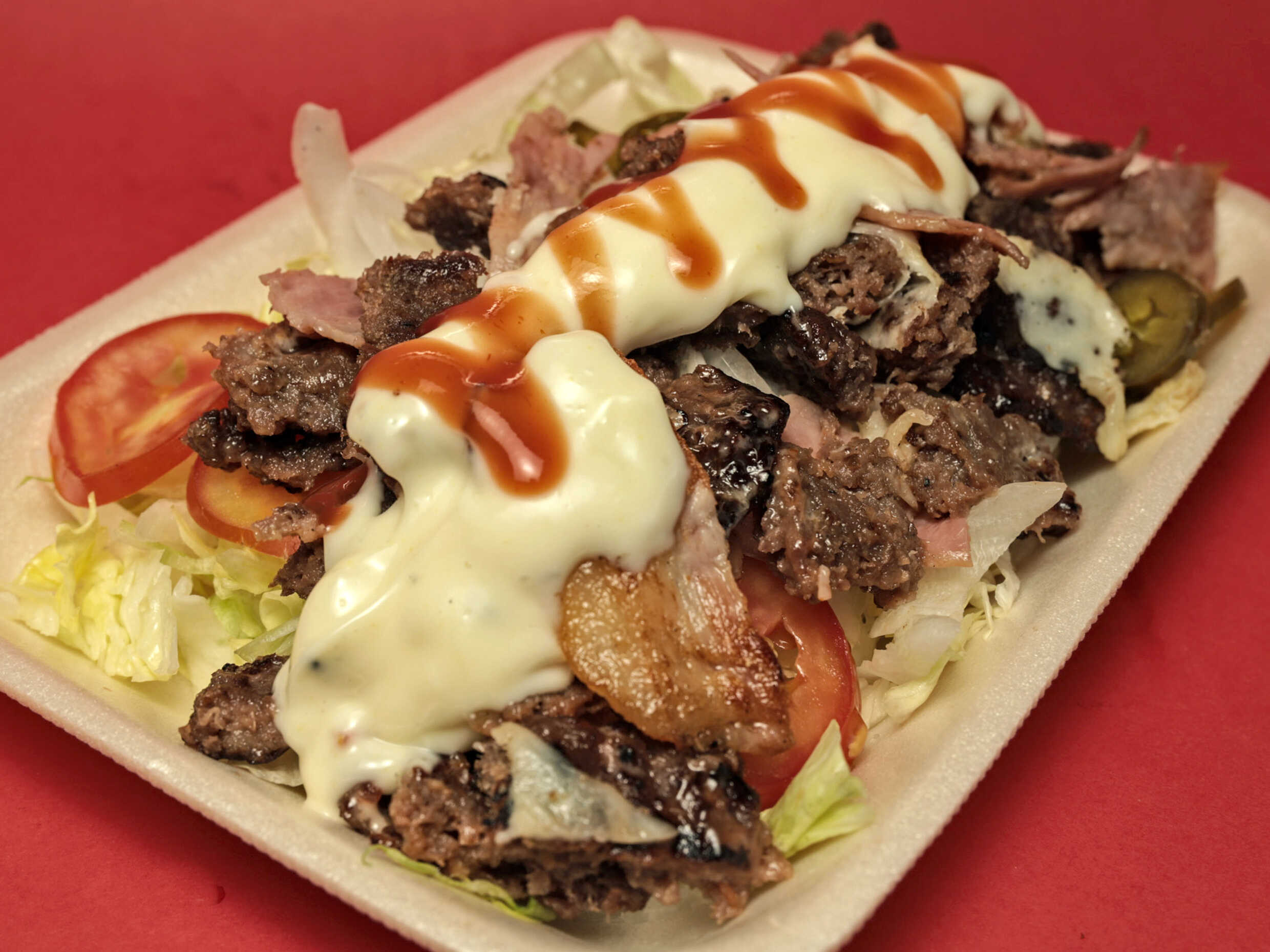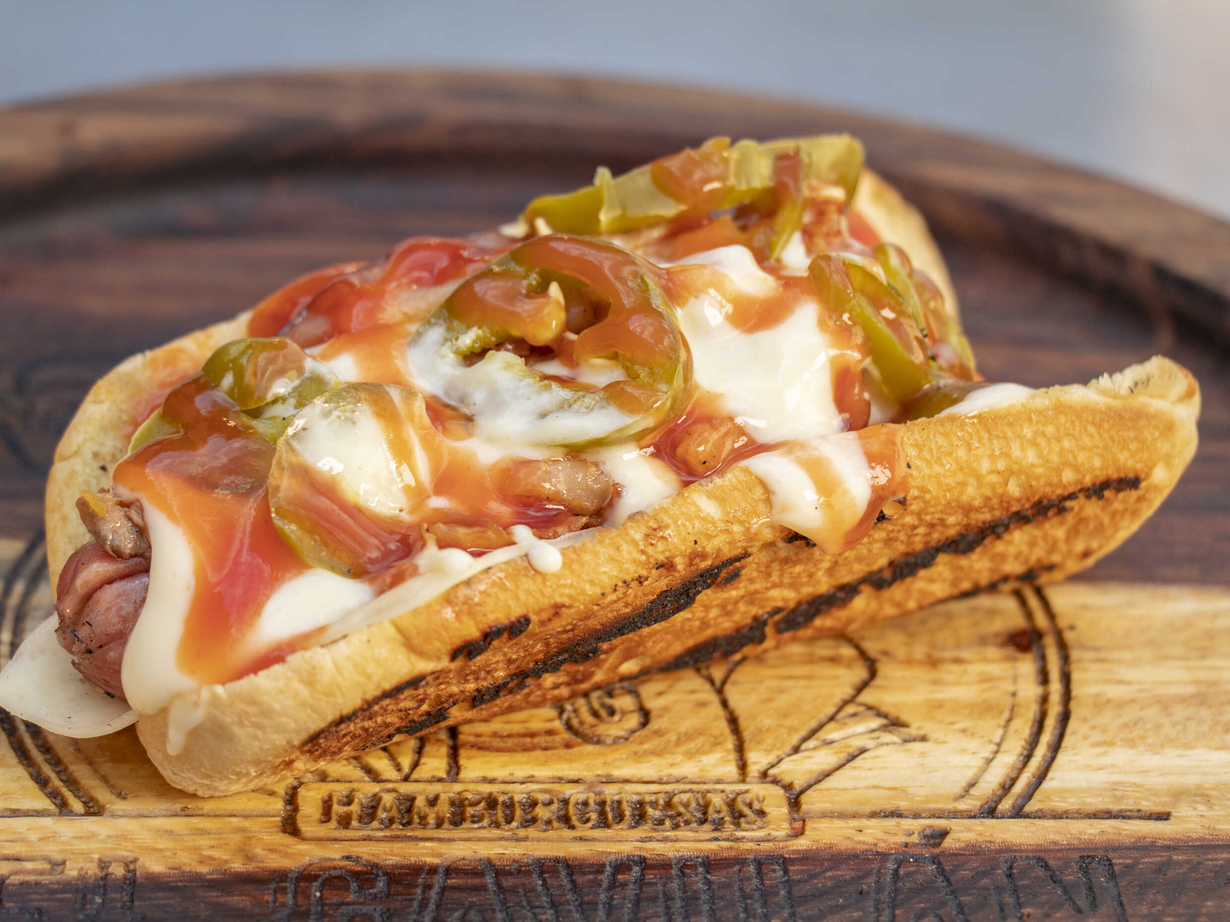 Doble carne, doble queso, doble tocino, lechuga, tomate, chile, cátsup, melambrea y pan normal o para hot dog.