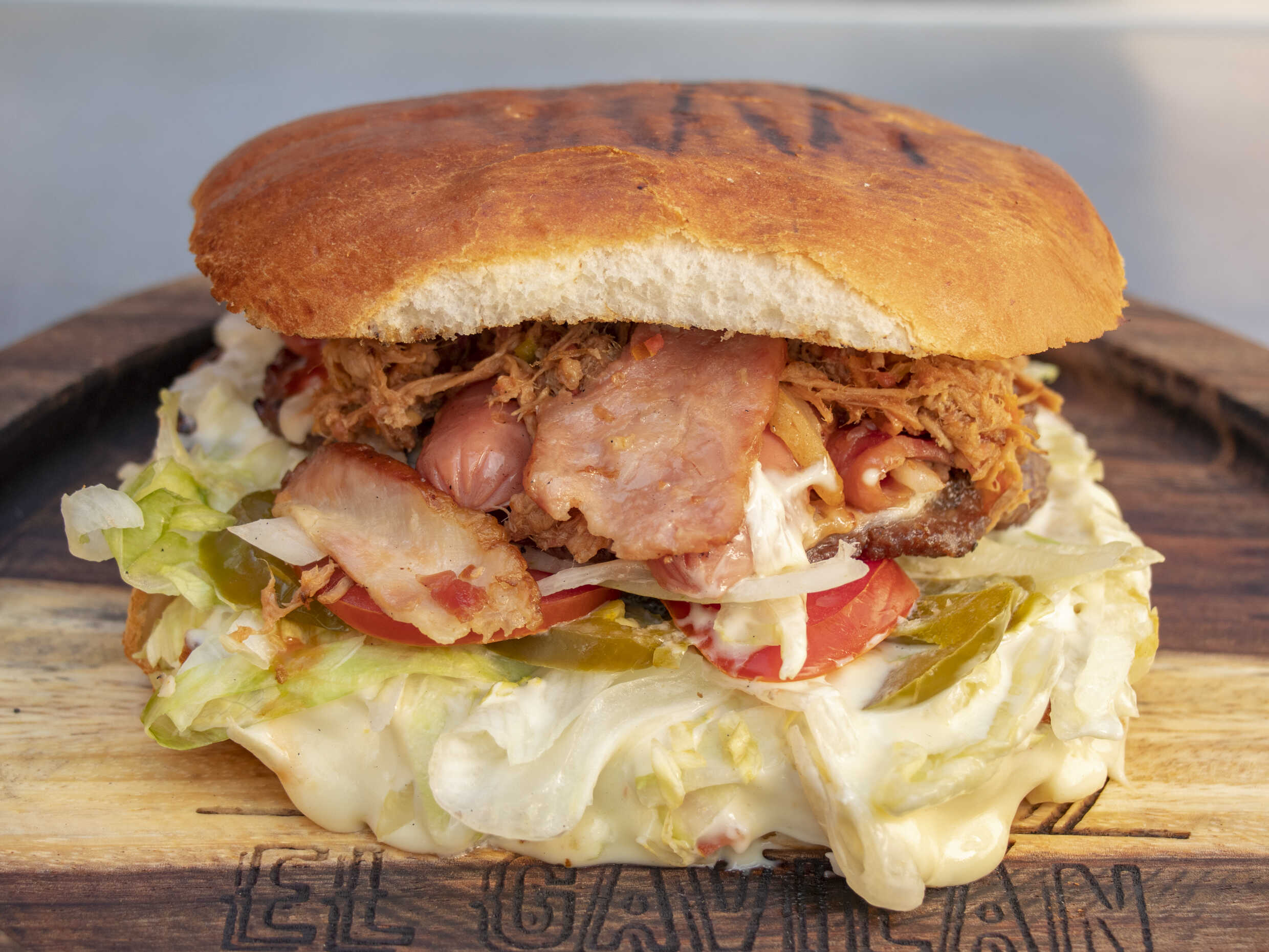 Carne de hamburguesa, carne desebrada, salchicha, queso, tocino, cátsup, lechuga, chile, tomate y melambrea.