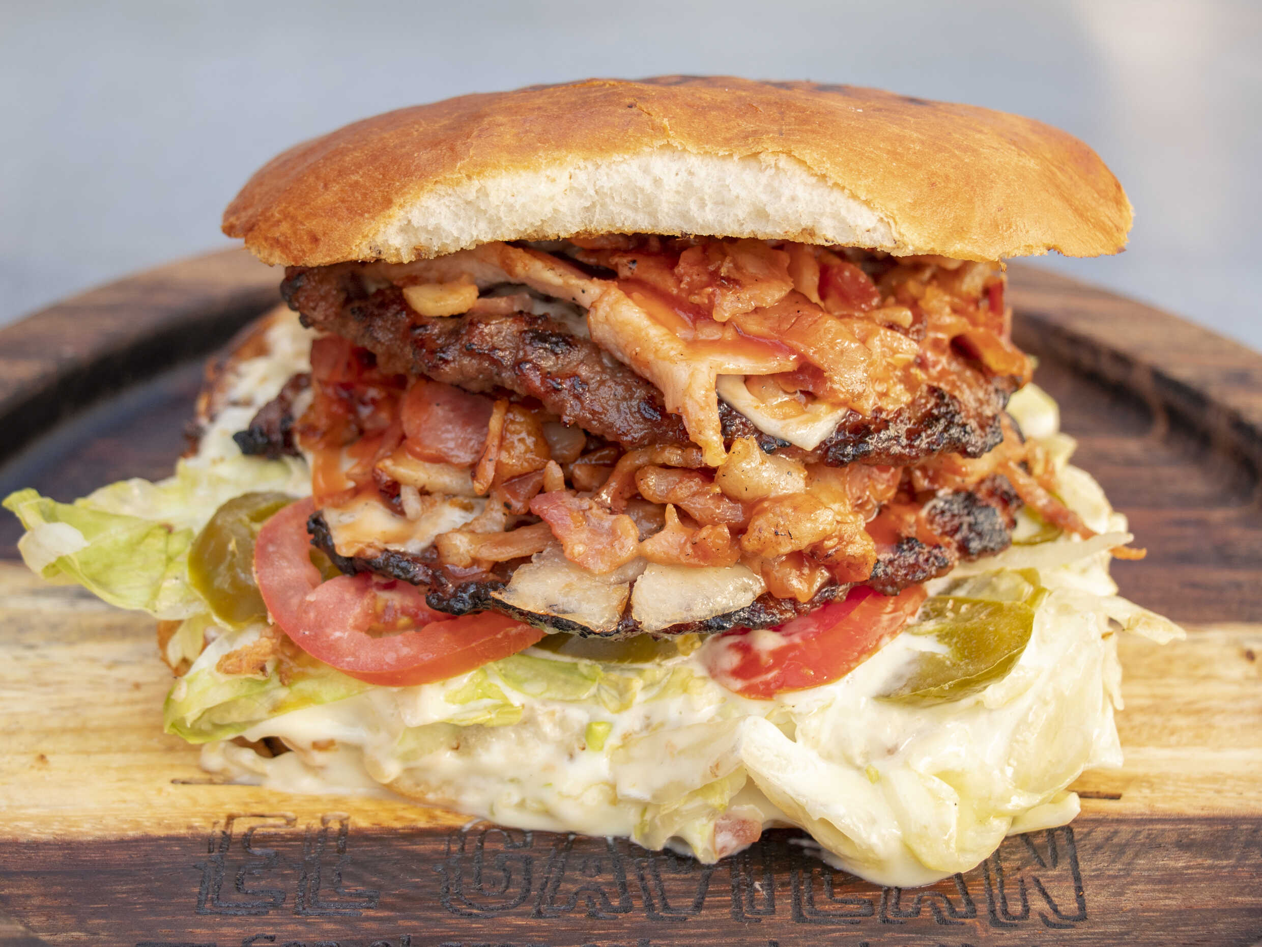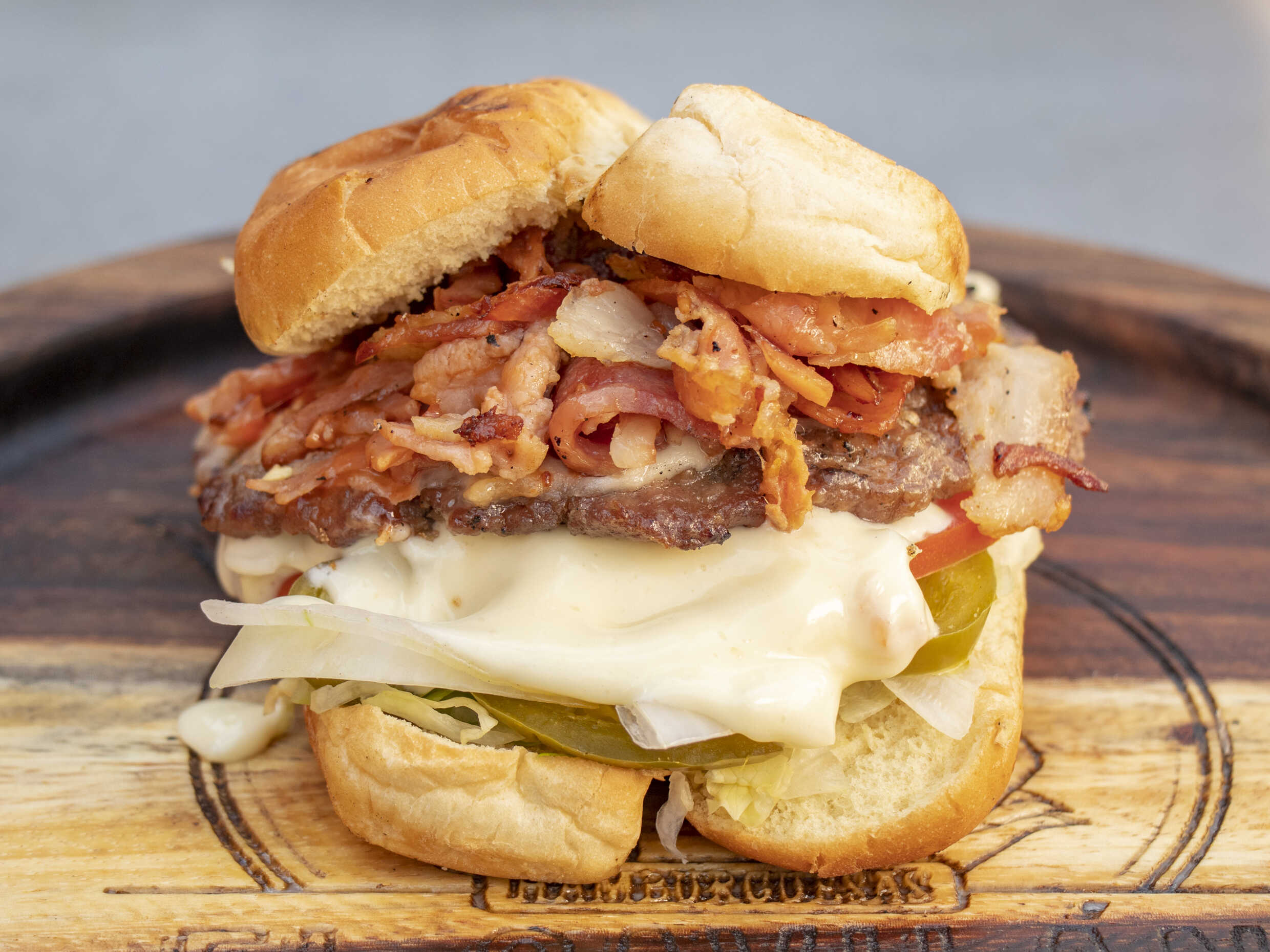 Doble carne, doble queso, doble tocino, lechuga, tomate, chile, catsup,melambrea, pan para hamburguesa