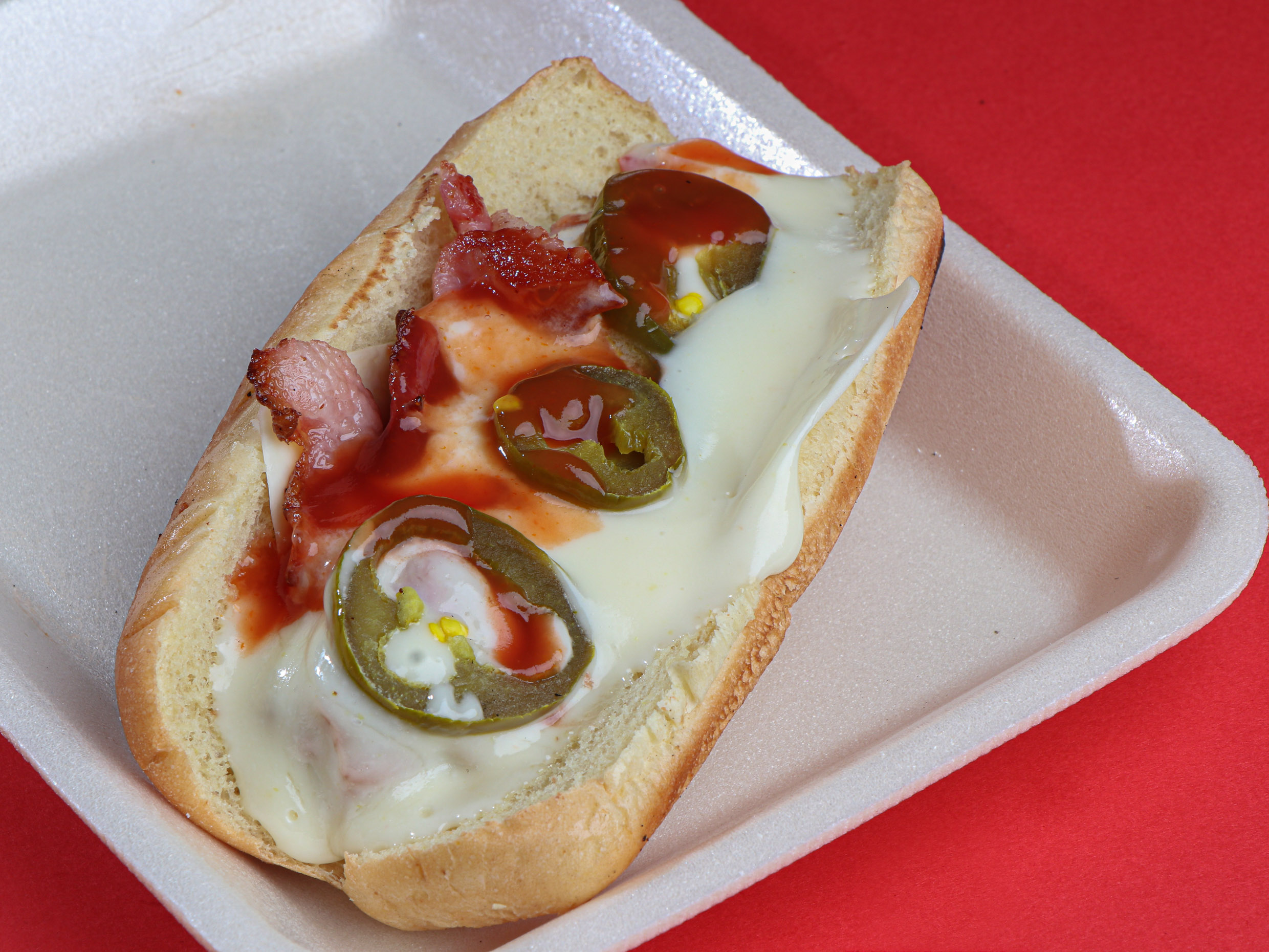Salchicha, queso, tocino, chile, mayonesa o melambrea y pan para hot dog.