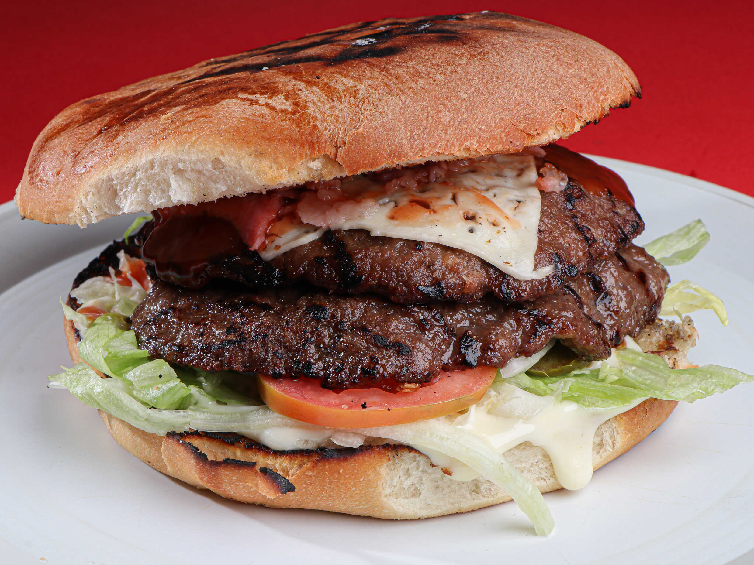 Doble carne, doble queso, doble tocino, lechuga, tomate, chile, catsup,melambrea, pan para hamburguesa