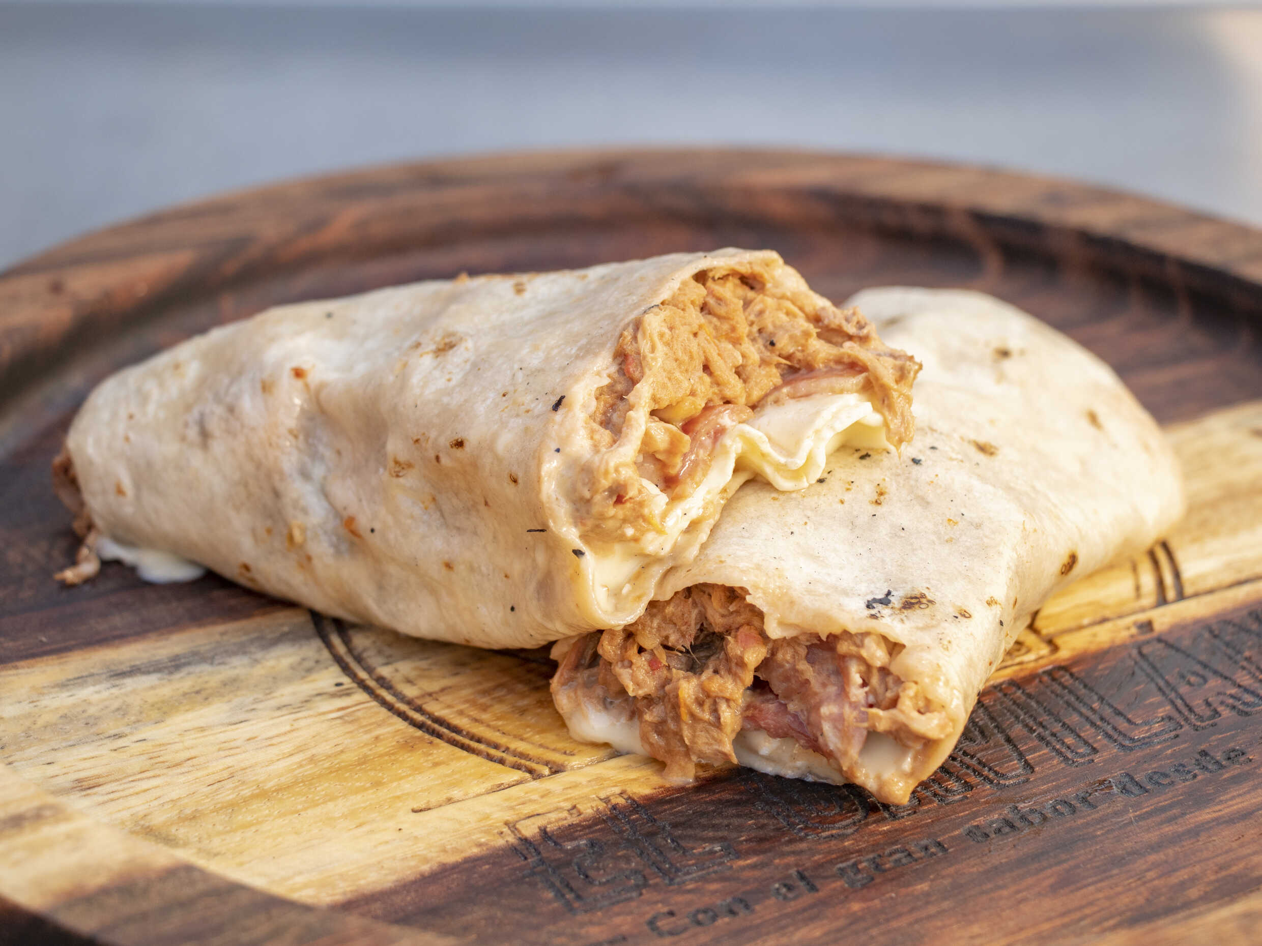 Carne deshebrada, mayonesa o melambrea, queso, tocino y tortilla de harina