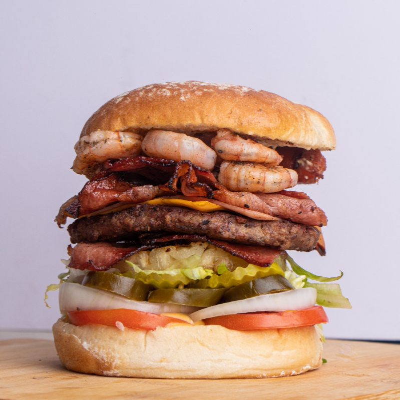 camaron, pan con mantequilla, carne angus 100 gramos, tocino, piña, queso amarillo, jamon lechuga, jamon, chiles curtidos, cebolla, mayonesa, catsup, mostaza