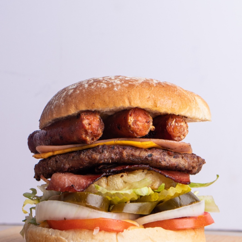 doble carne, pan con mantequilla, chorizo argentino, carne angus 100gramos tocino, piña, queso amarillo, jamon, lechuga, tomate chiles curtidos, cebolla mayonesa y mostaza