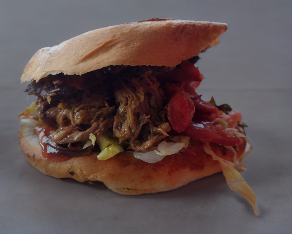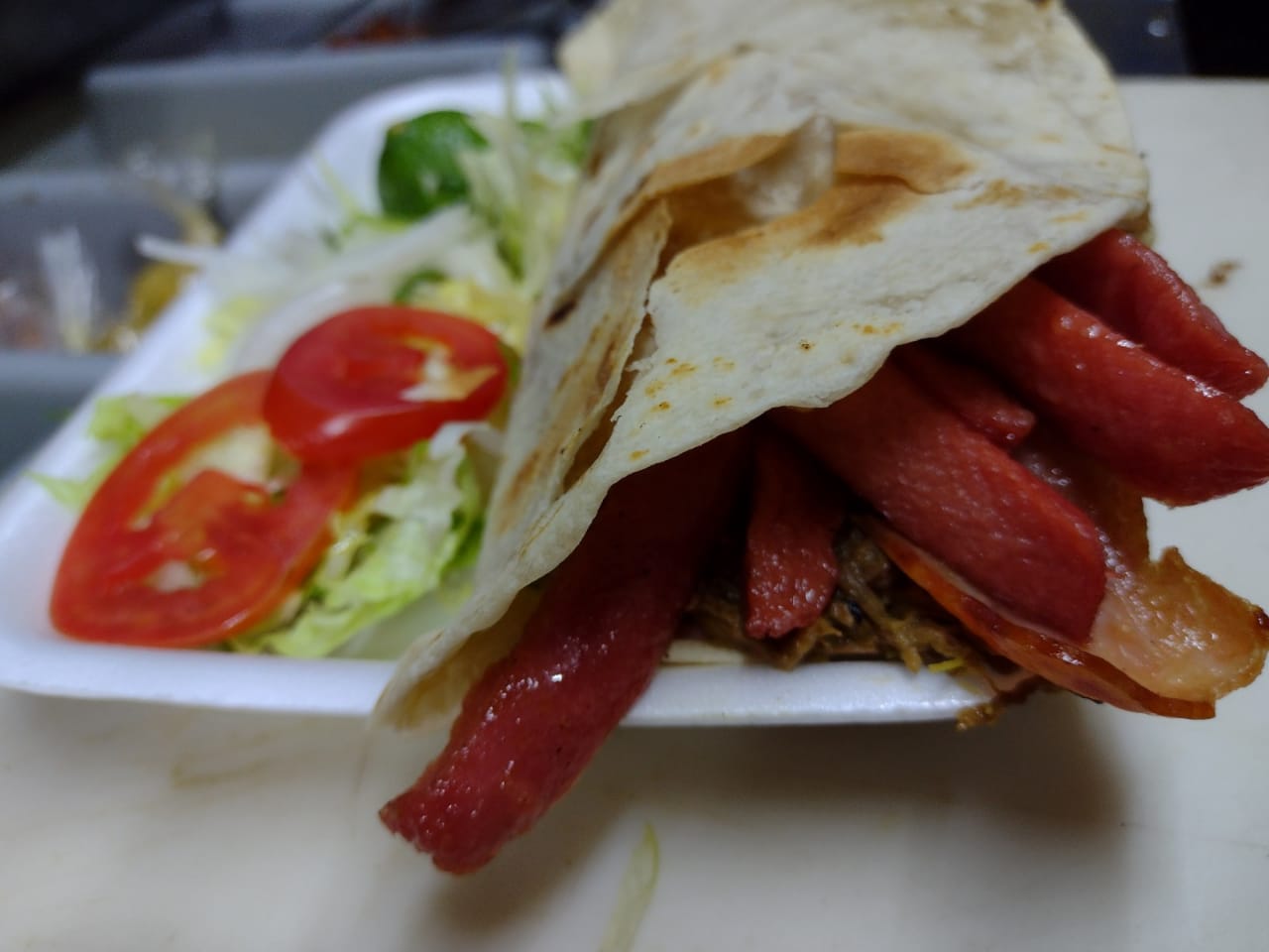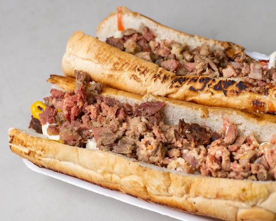 Chori carne, queso blanco, queso amarillo, jamón, tocino y piña.