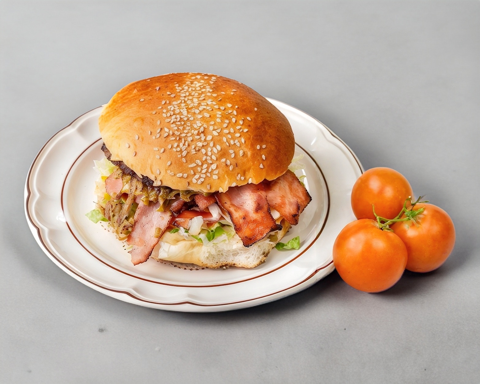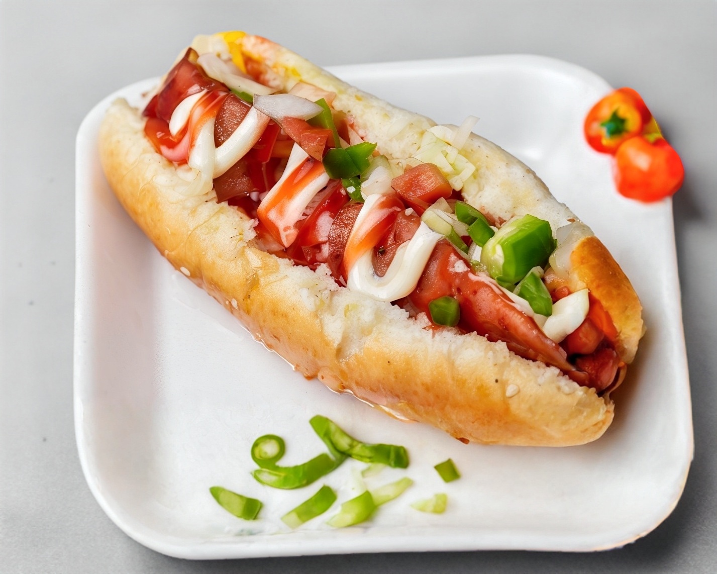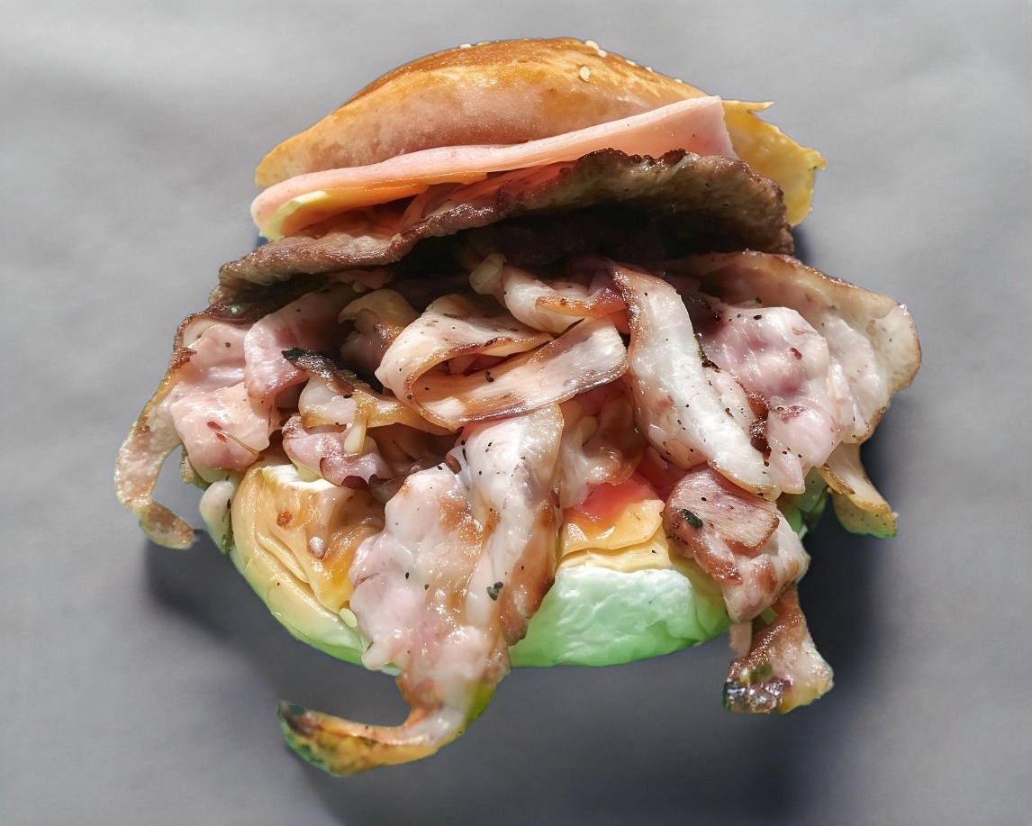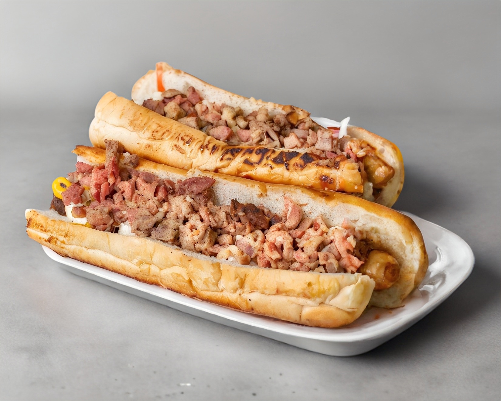 Salchicha, tocino, carne de hamburguesa, aderezos.