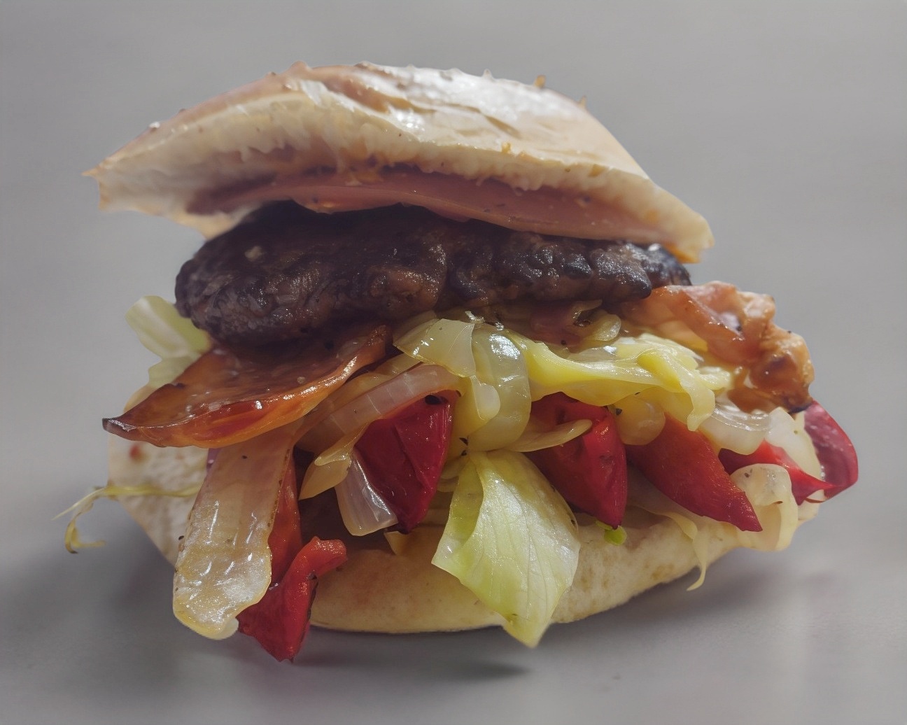 Salchicha, tocino, carne de hamburguesa, aderezos de hamburguesa y pico de gallo.