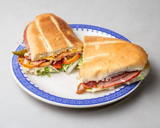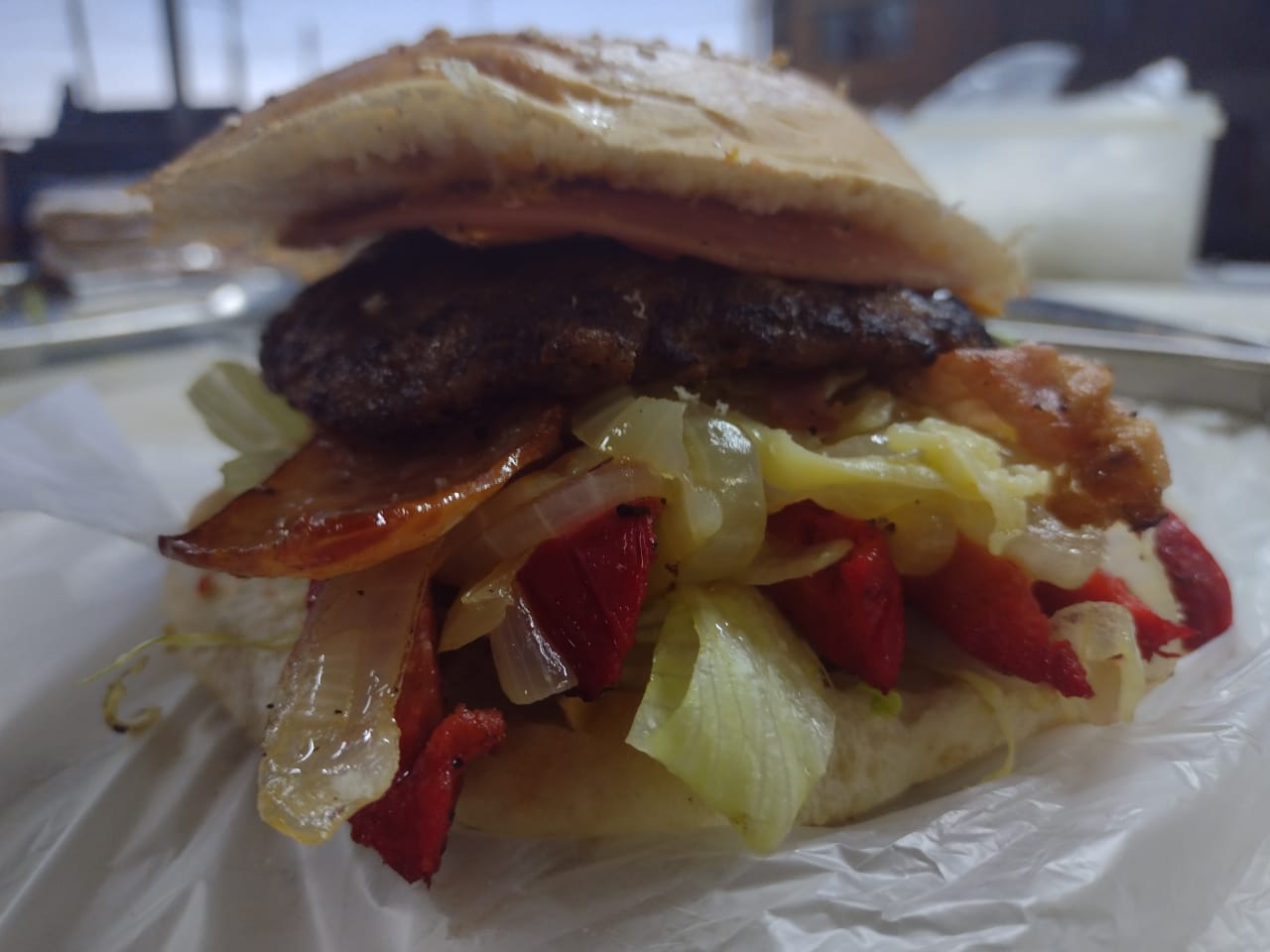 Carne, jamón, queso amarillo, pierna, queso blanco, tocino y aguacate.
