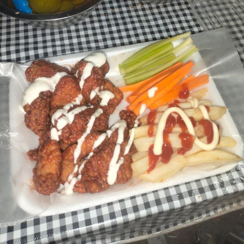 Boneless 250 gr, Salsa BBQ, aderezo ranch, papas fritas, zanahoria, apio.