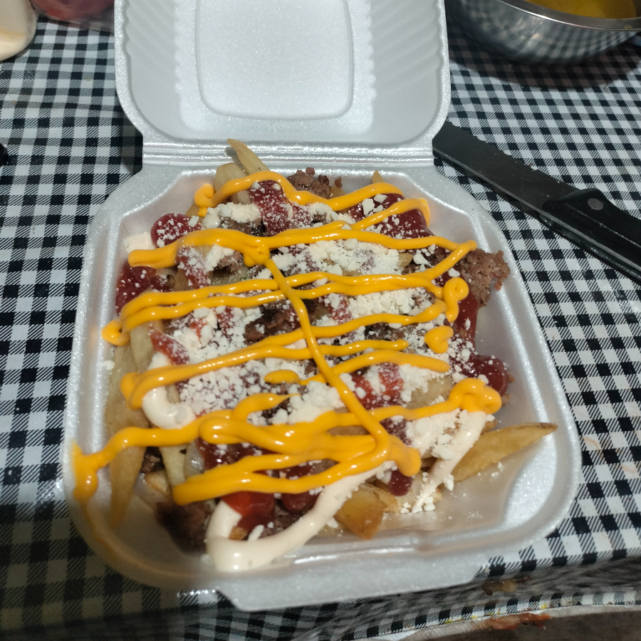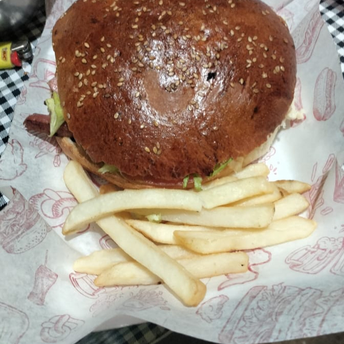 Carne de res, salchicha, lechuga, tomate, mayonesa, mostaza, pepinillos, chile en curtido, papas fritas, cátsup.