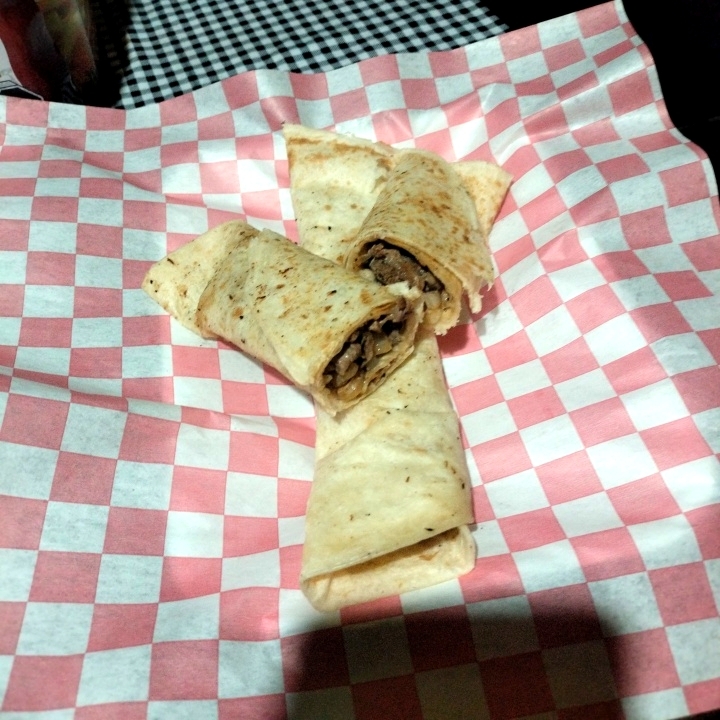 Carne de res asada, mayonesa, cebolla caramelizada, tortilla de harina