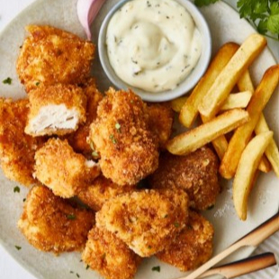 Porción de nuggets de pollo crujientes y calientitos.