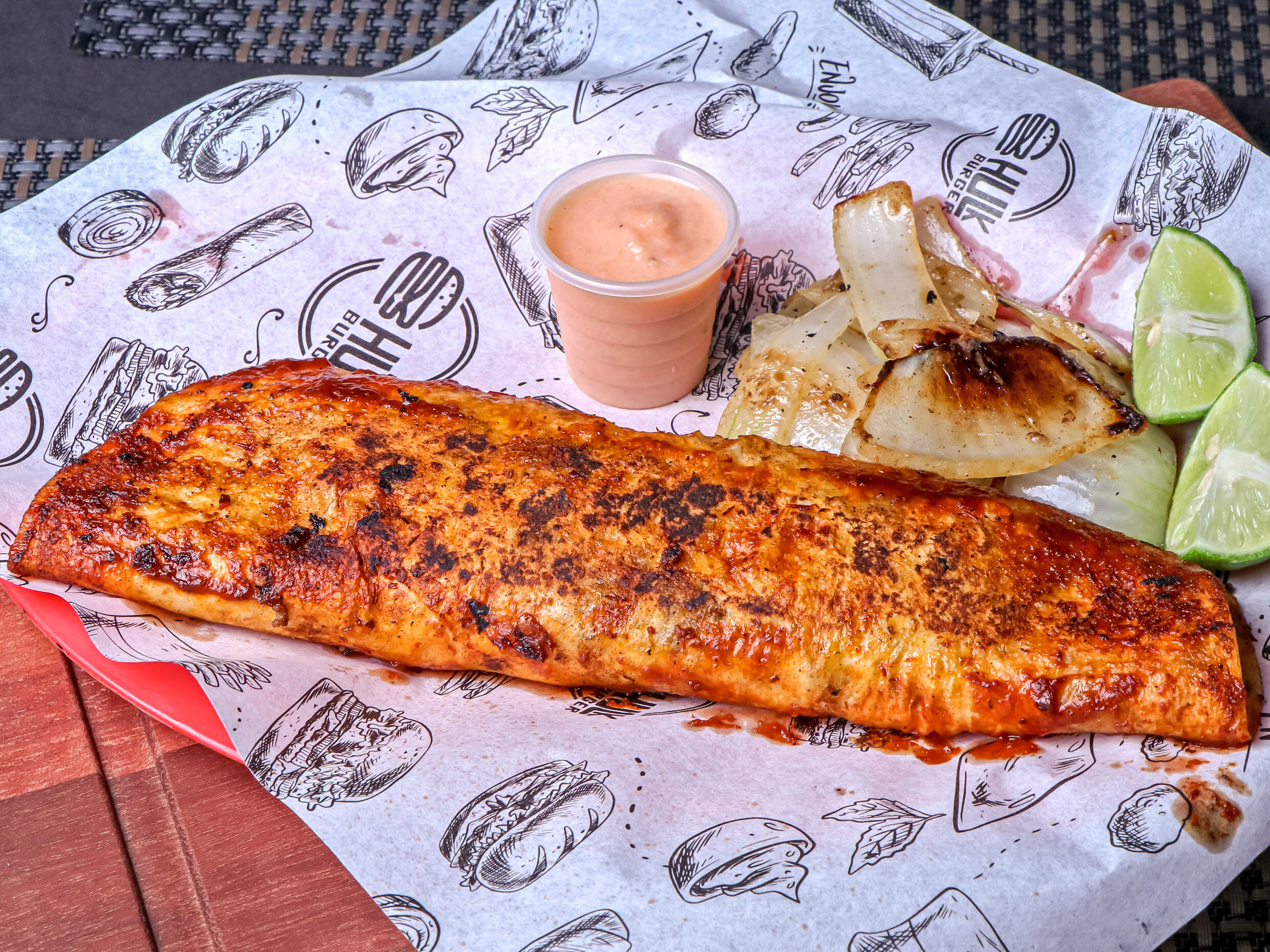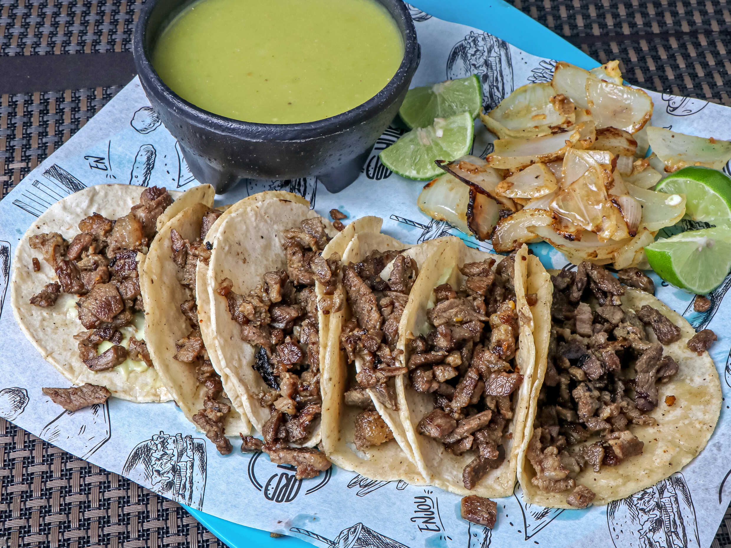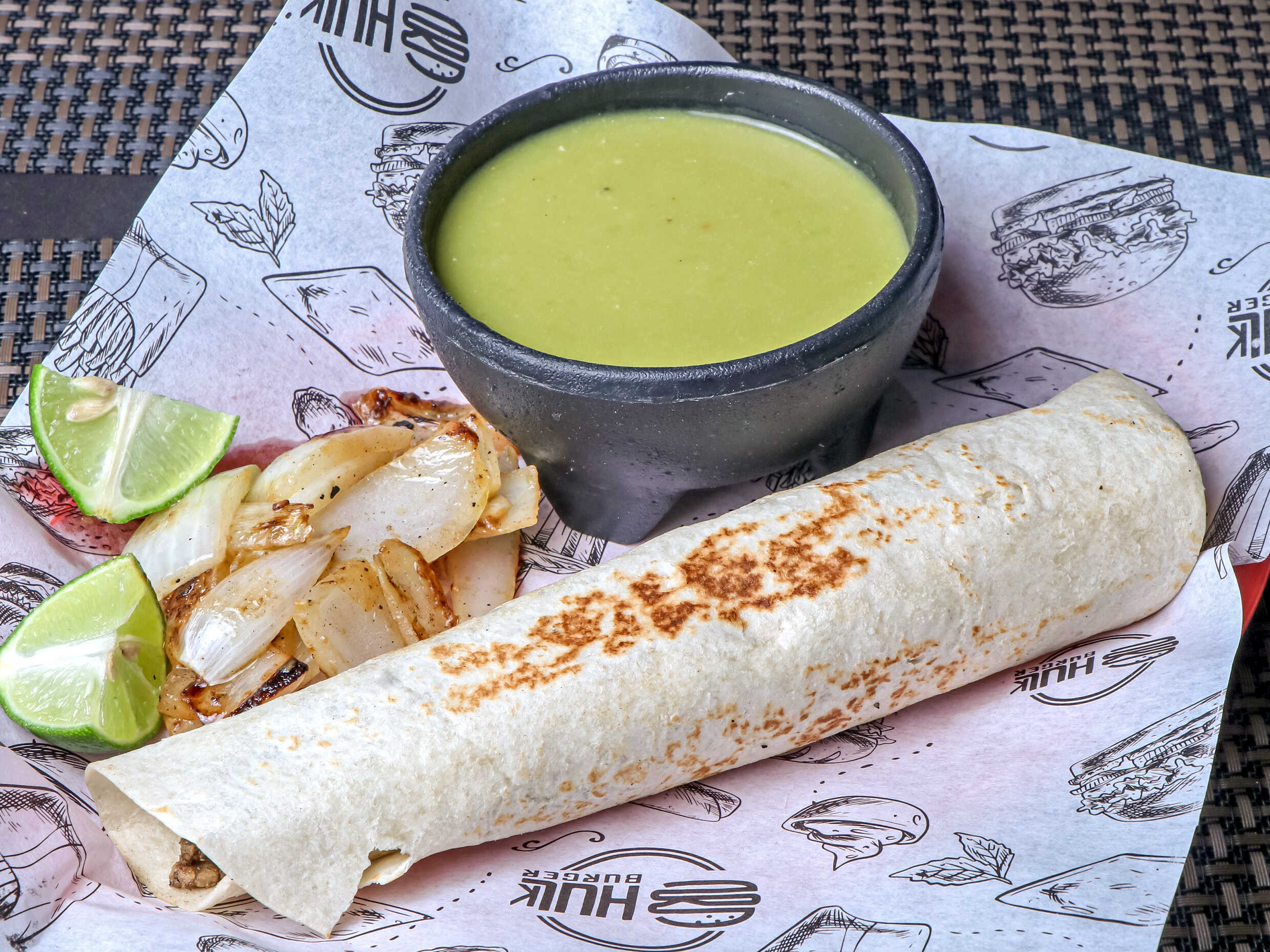 Tortilla de harina con carne asada, queso fundido, acompañada de cebolla, cilantro, aderezos y salsas.