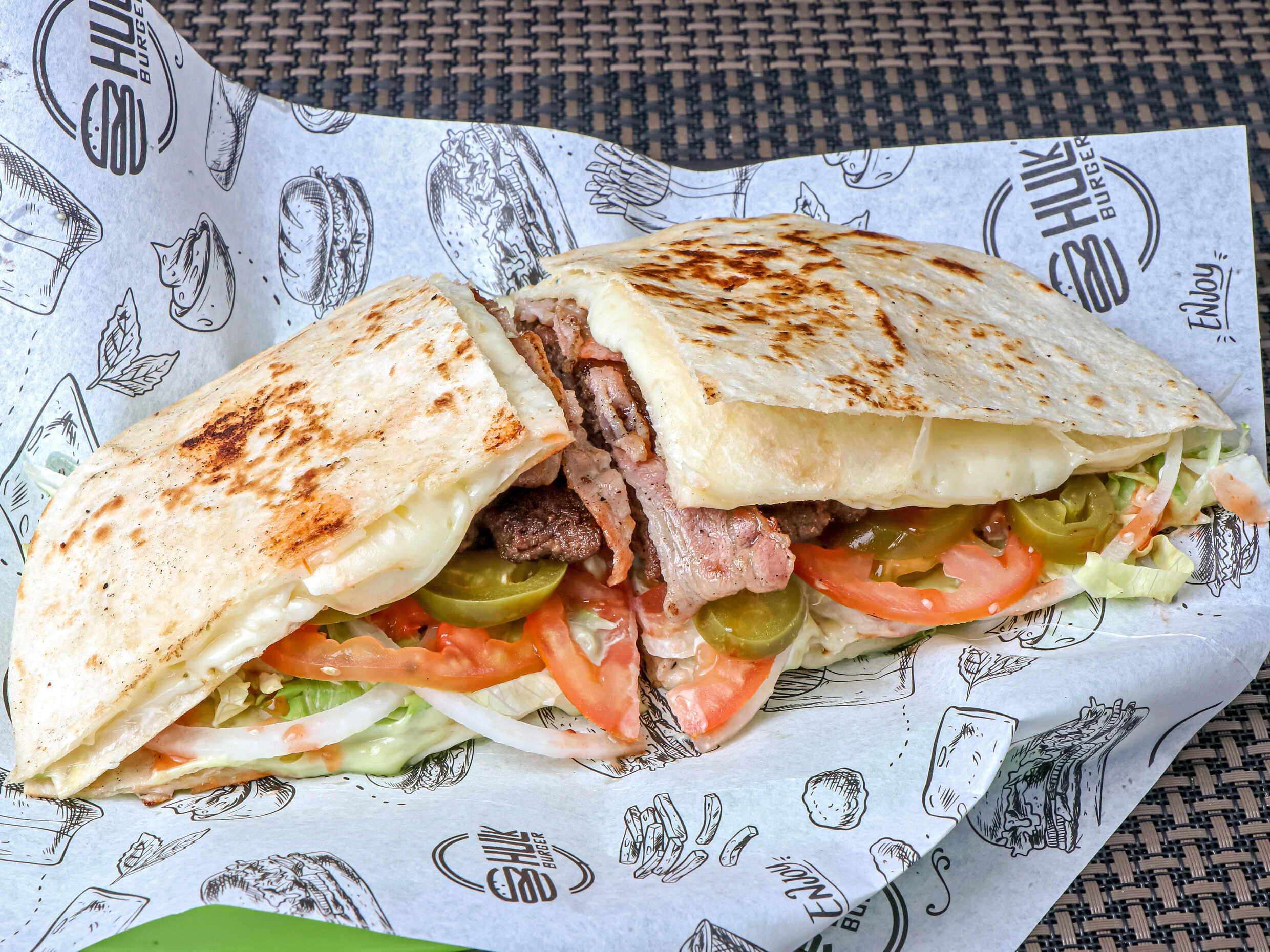 Tortilla de harina, queso fundido, carne de arrachera, verduras, tomate, cebolla y aderezos.