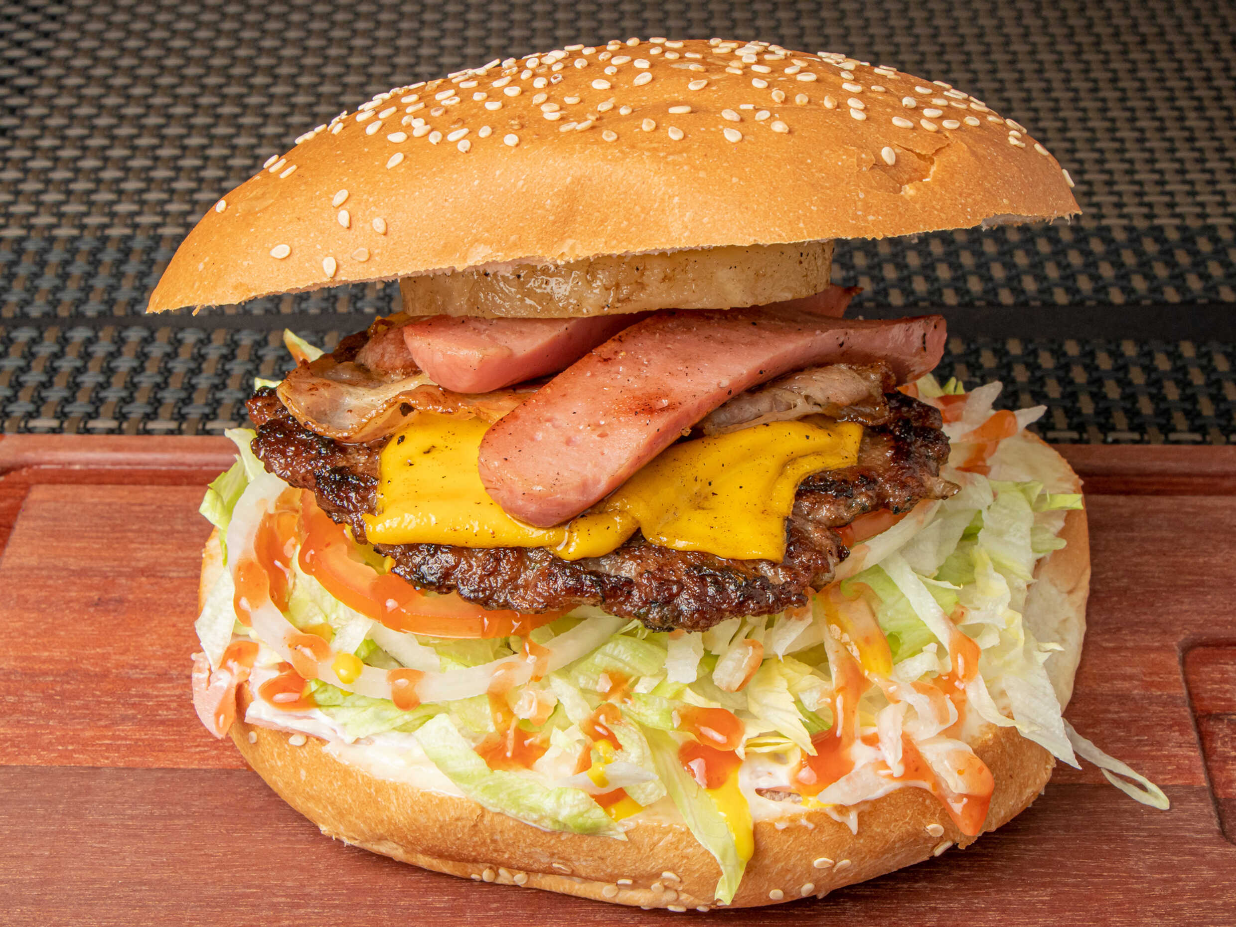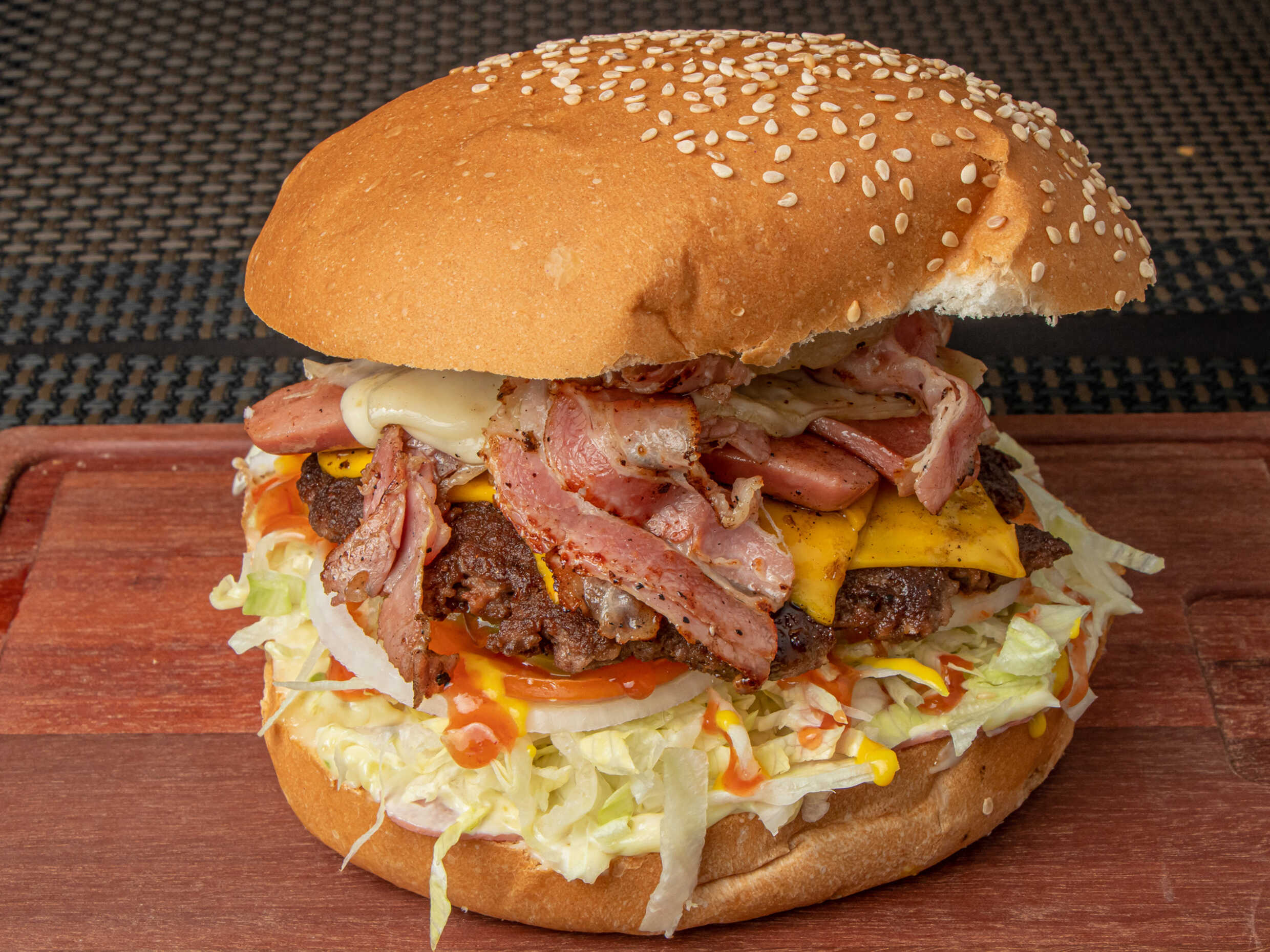 Carne de sirloin, doble tocino, queso blanco, queso amarillo, jamón, salchicha y aderezos.