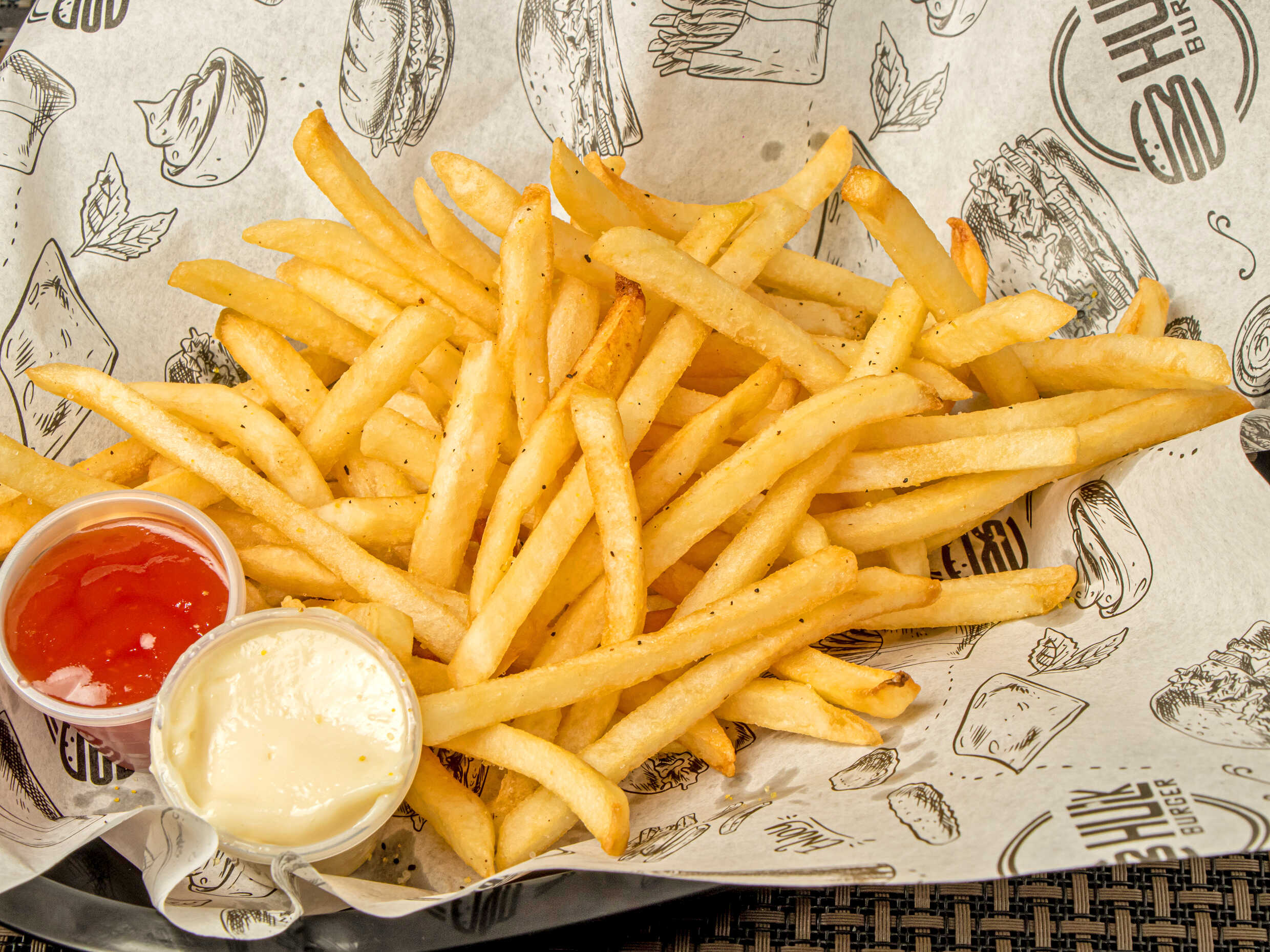 Tradicionales papás a la francesa preparadas con aderezos de la casa , salchicha y parmesano