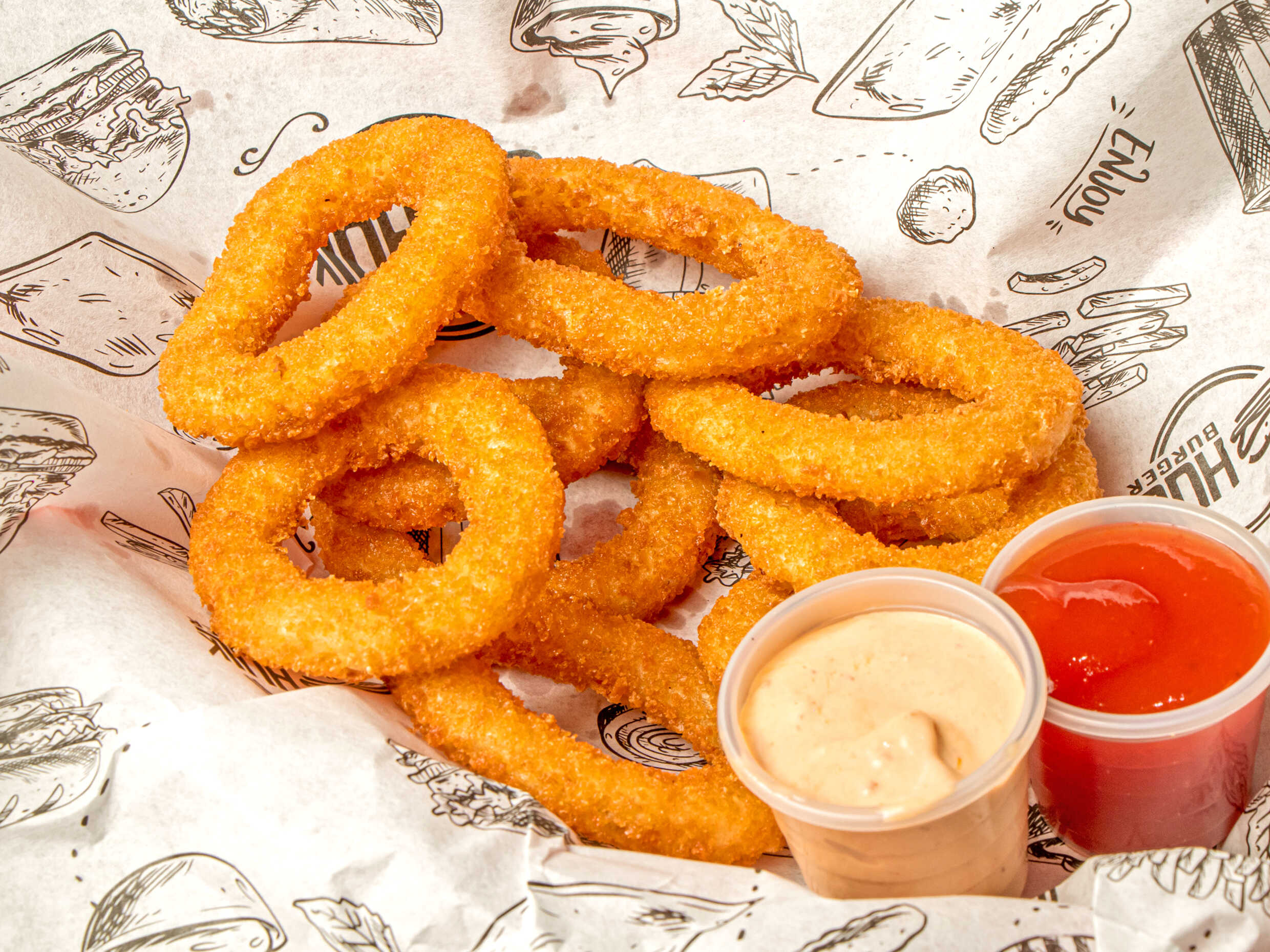 Aritos de cebolla fritos con aderezos.