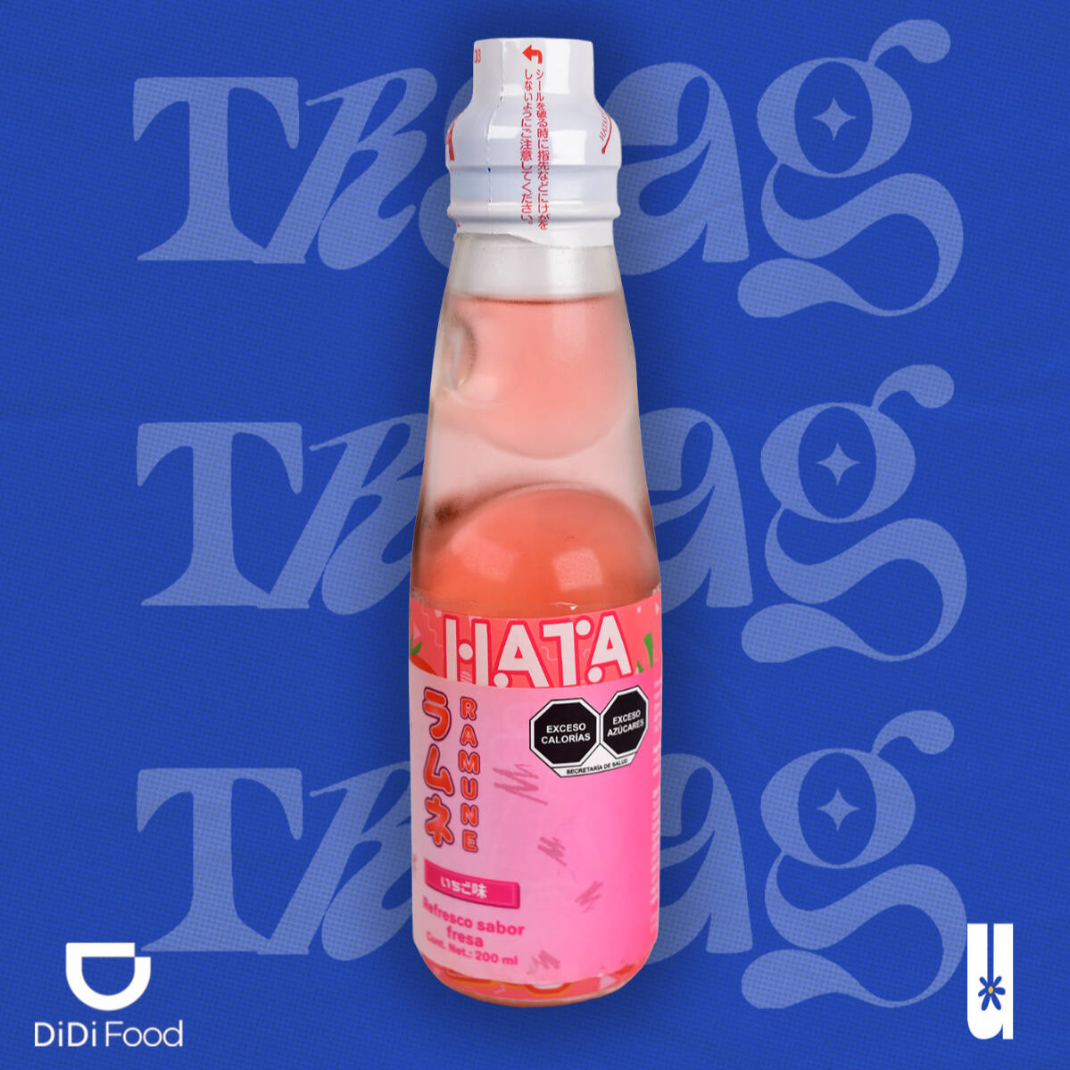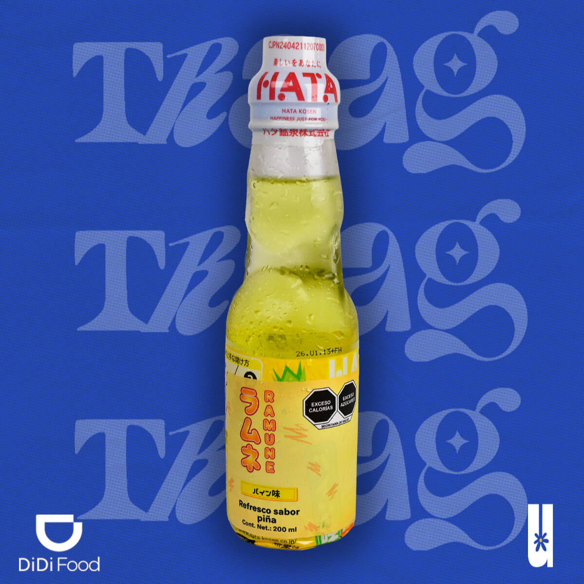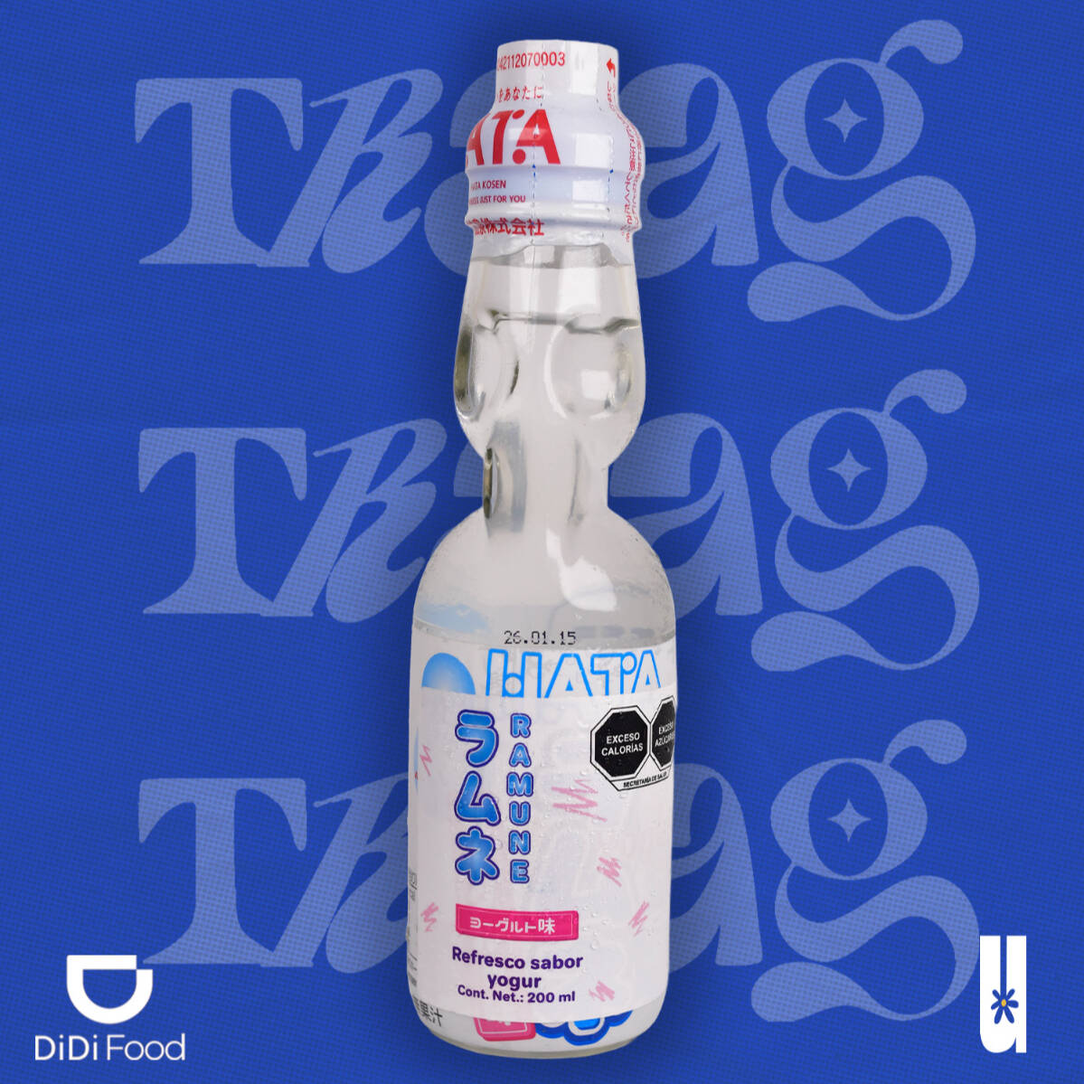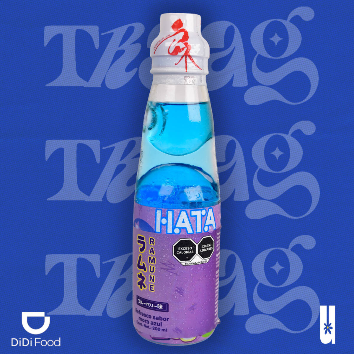 Hata Ramune, una popular bebida gaseosa japonesa conocida por su botella de vidrio con una canica que sella la apertura.