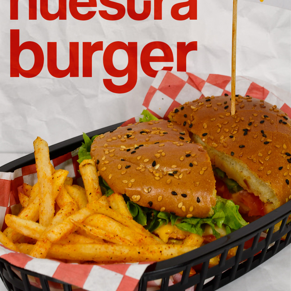 Hamburguesa de pechuga de pollo empanizada con panko, tomate, lechuga romana, queso blanco, queso americano, cebolla y mayonesa