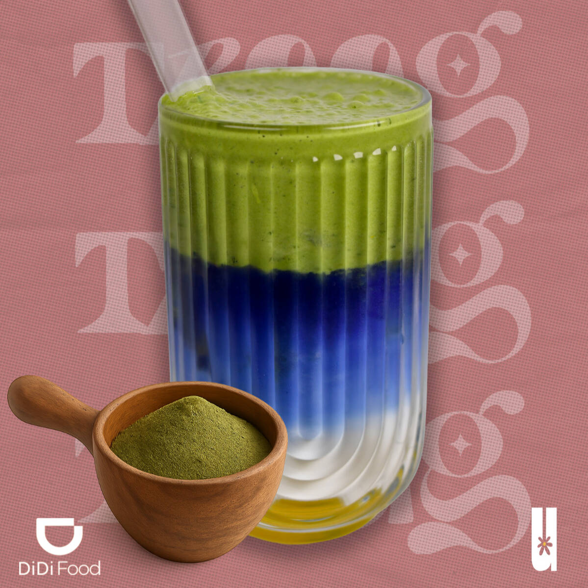 Leche de preferencia , Butterfly Pea Tea, Jarabe de Maracuyà y Matcha