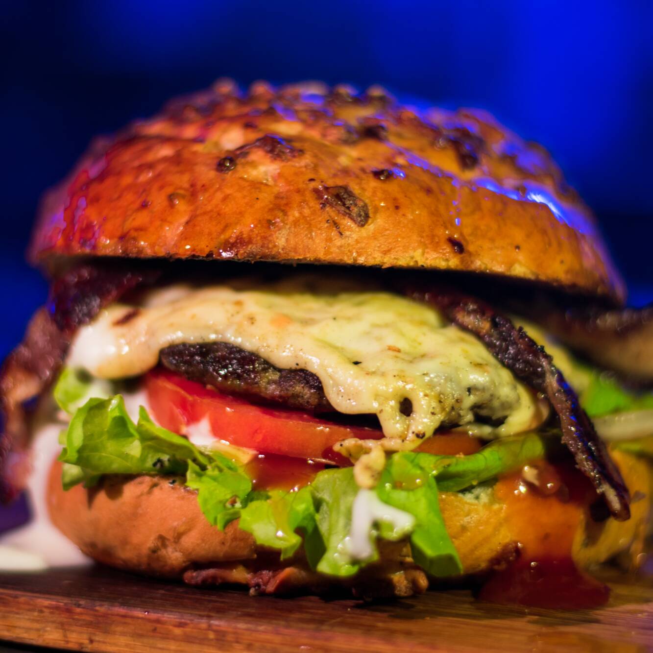 130 gramos de fresca carne de res, pan artesanal de costra de queso, lechuga, tomate, cebolla, chile, tocino, queso gratinado, catsup y ranch.