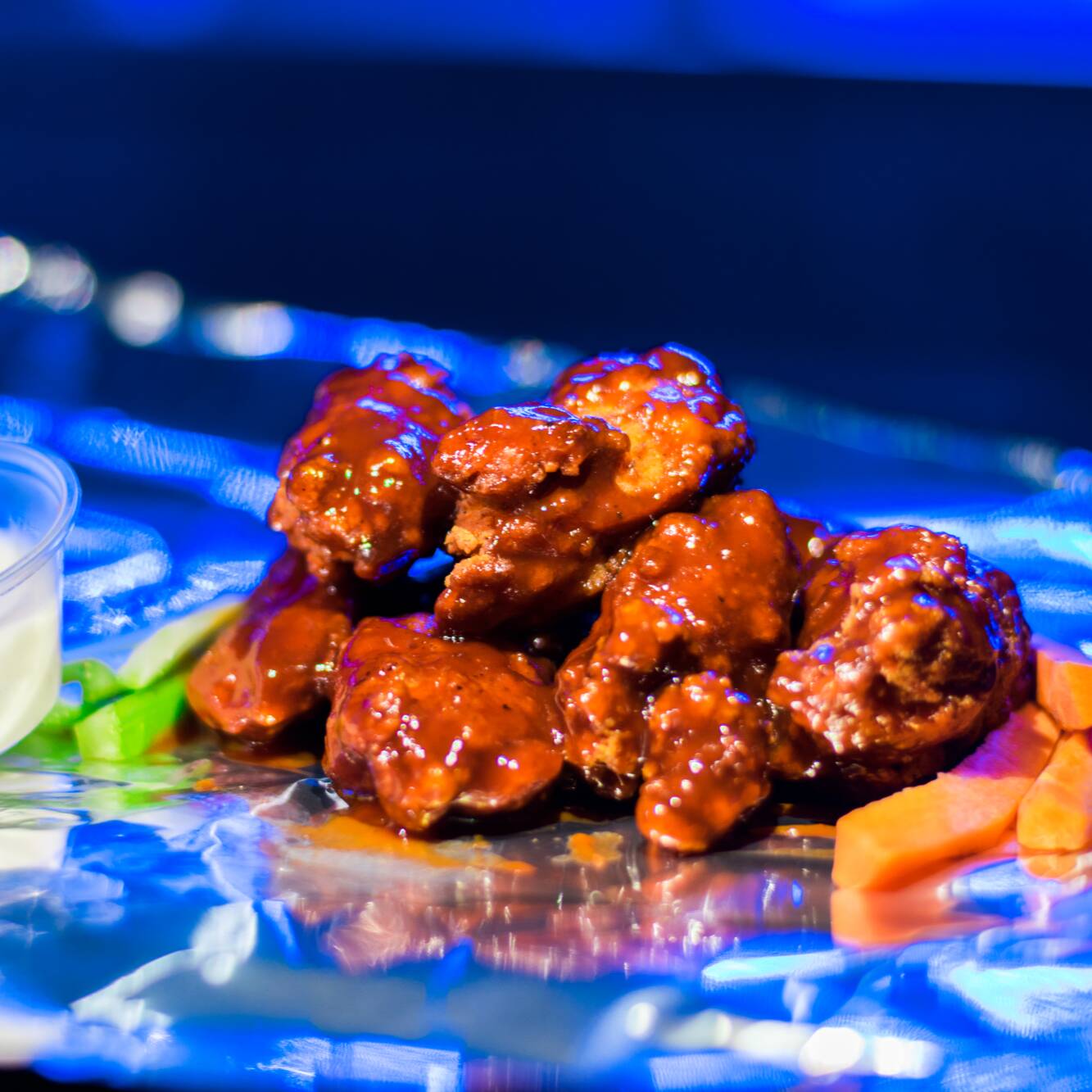 crujientes trozos de pechuga de pollo empanizados bañados en salsa a tu elección, 280 gr. acompañados de apio, zanahoria y aderezo ranch