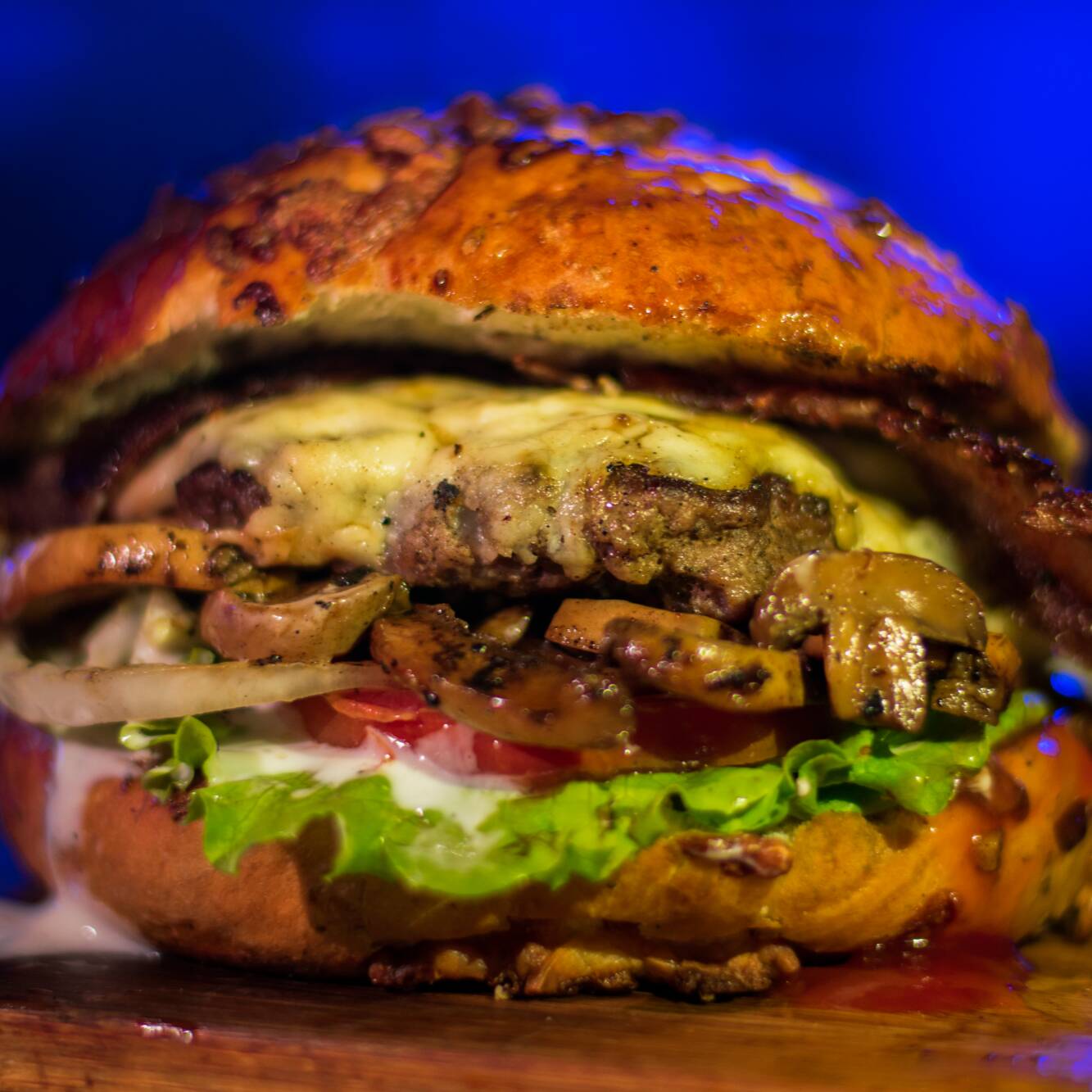 130 gramos de fresca carne de res, pan artesanal costra de queso, champiñones con queso gratinado, lechuga, tomate, cebolla, chile, tocino, queso gratinados, catsup y ranch.