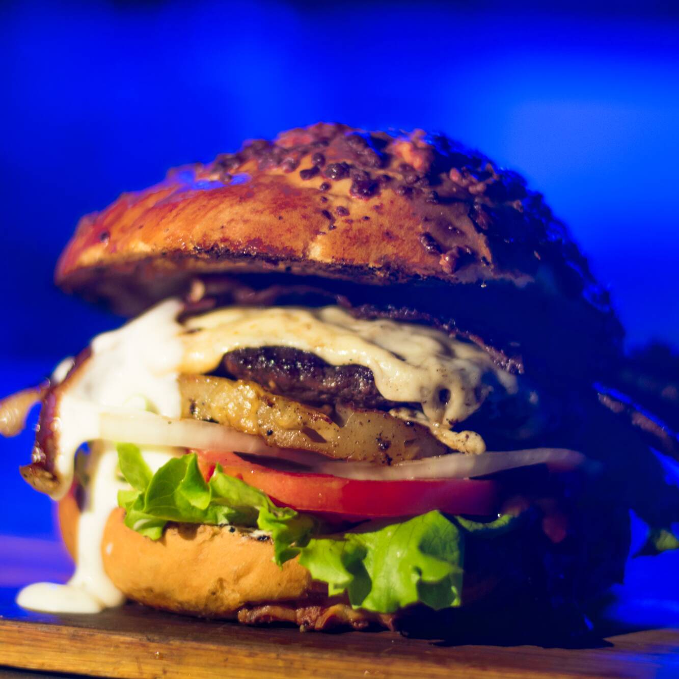 130 gramos de fresca carne de res, pan artesanal costra de queso, piña, lechuga, tomate, cebolla, jalapeños, tocino, queso gratinado, catsup y ranch.