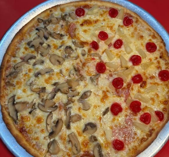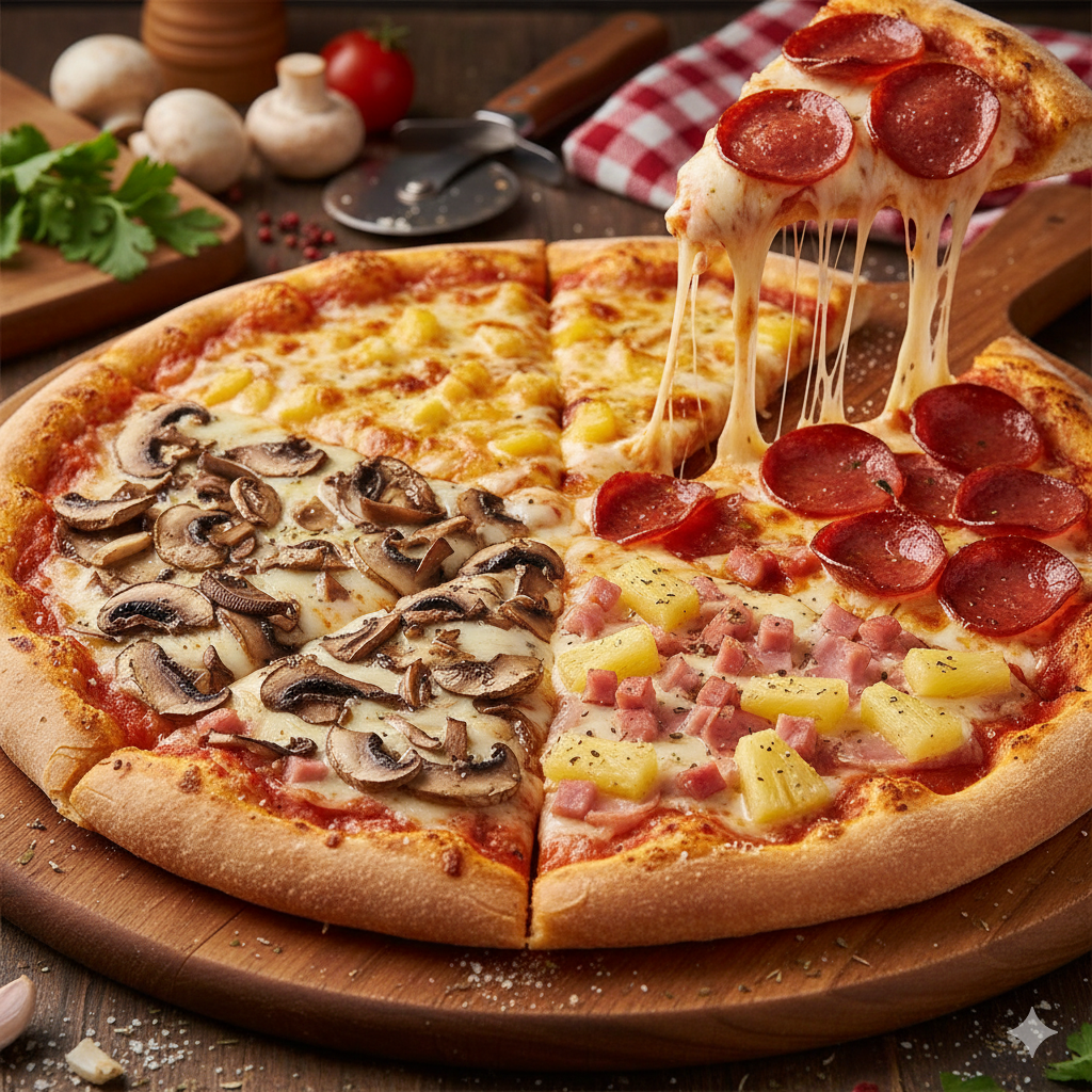 Deliciosa pizza familiar, 1/4 de pepperoni, 1/4 de queso, 1/4 de piña y jamón más 1/4 de champiñones.
