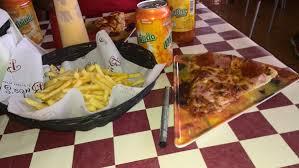 Rebanada grande con tres ingredientes al gusto, porción de papas y refresco de lata.