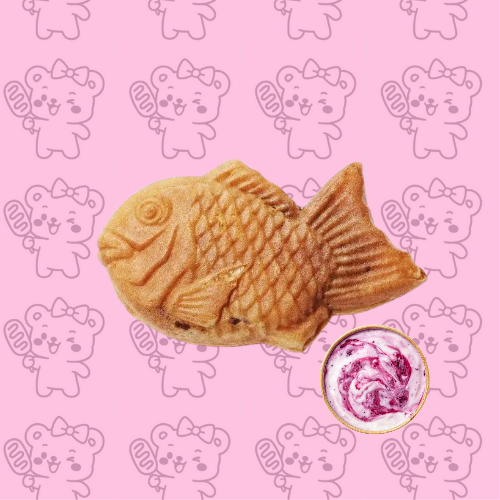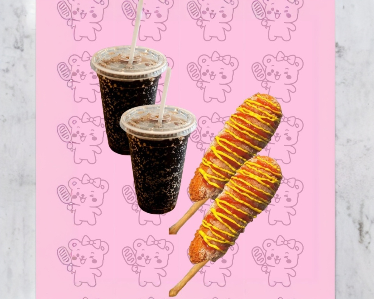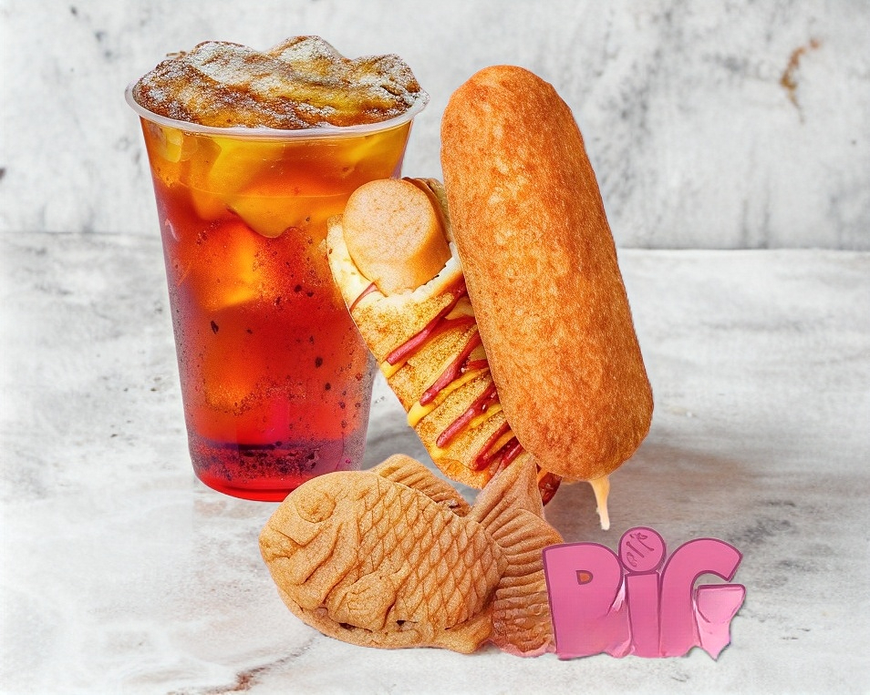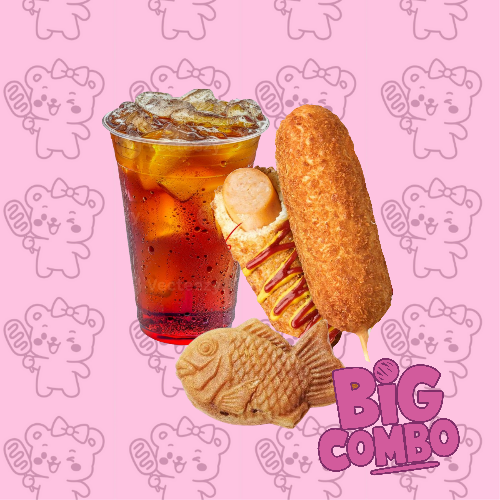 El combo perfecto llegó: refrescante té de durazno, banderilla regular y de postre un taiyaki con relleno deli de queso zarzamora