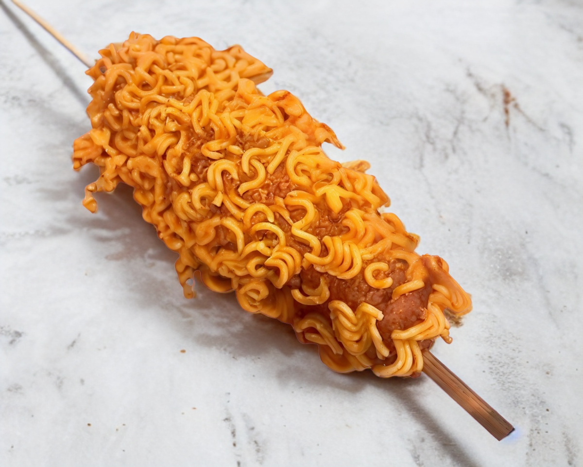 Salchicha cubierta de deliciosa masa y trocitos de ramen