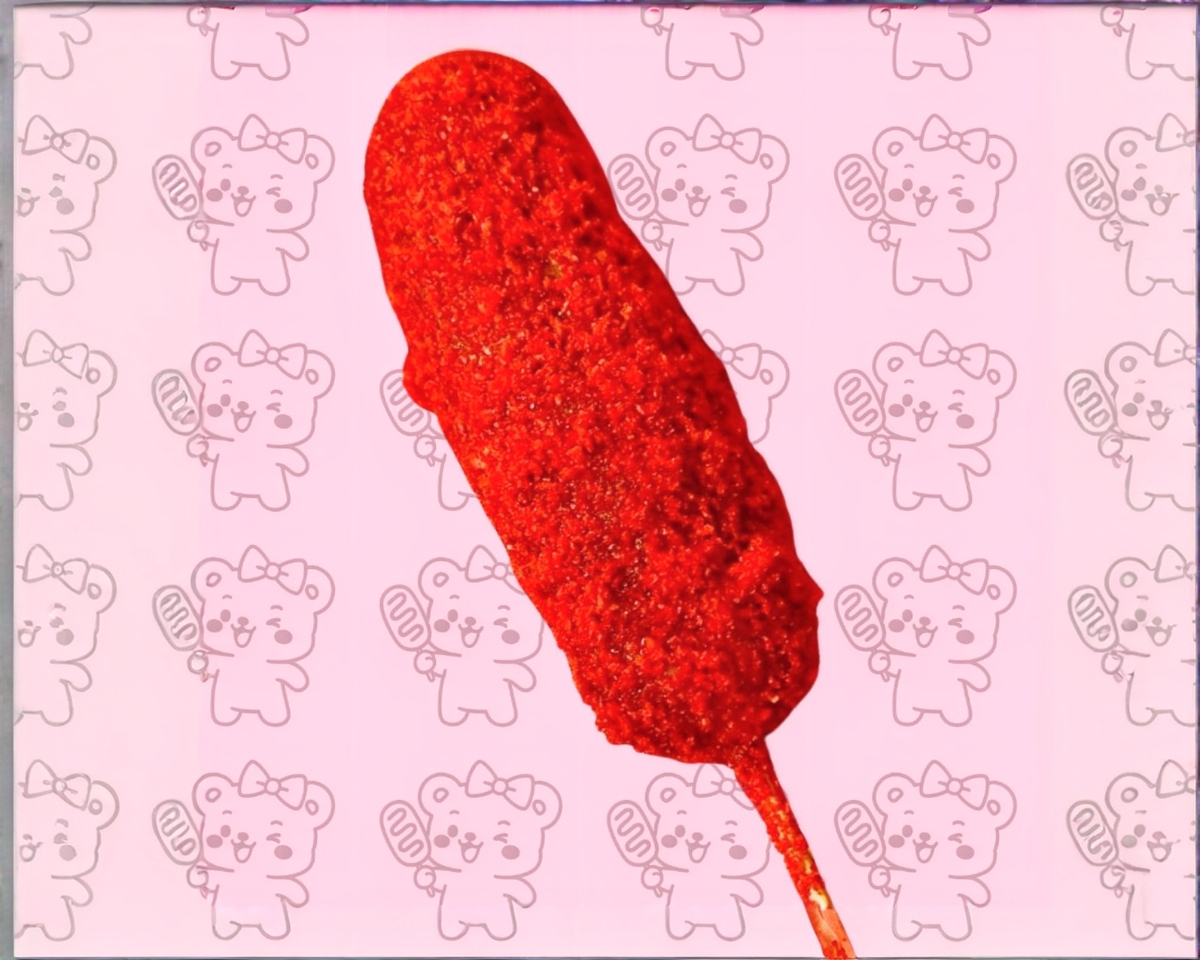 Salchicha cubierta de deliciosa masa frita, acompañada de chetos flaming hot triturado