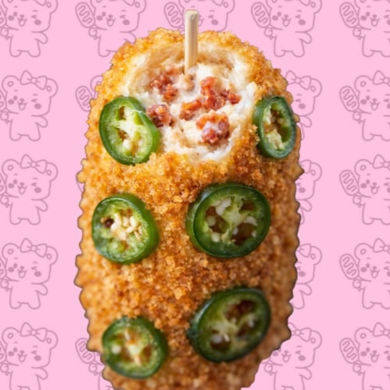 Deliciosa banderilla rellena de queso crema con tocino y cubierta de panko con rodajas de jalapeño acompañada de papas fritas
