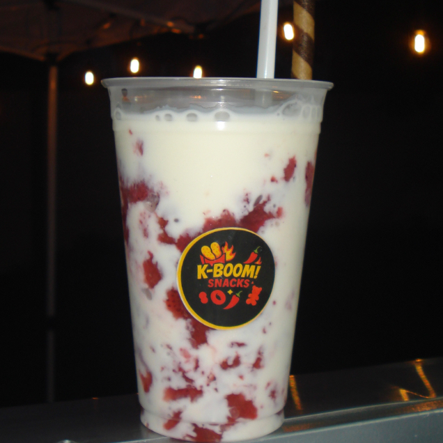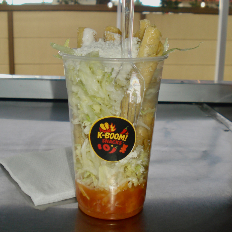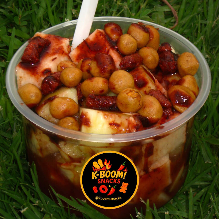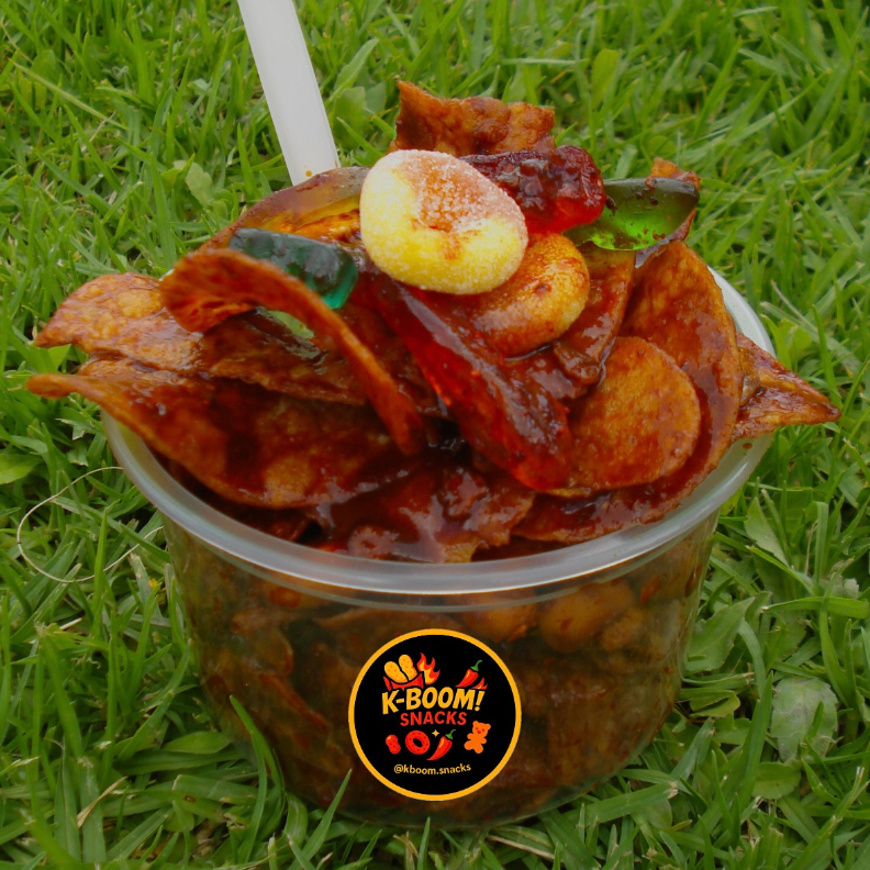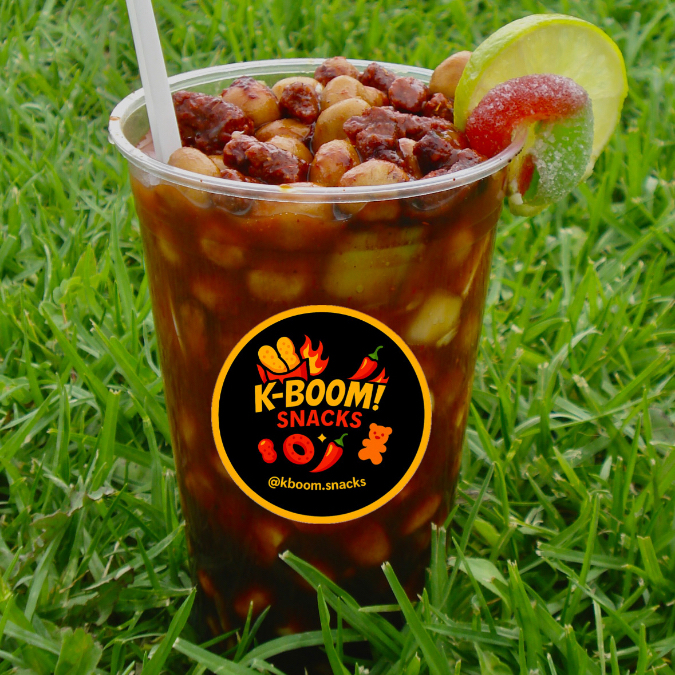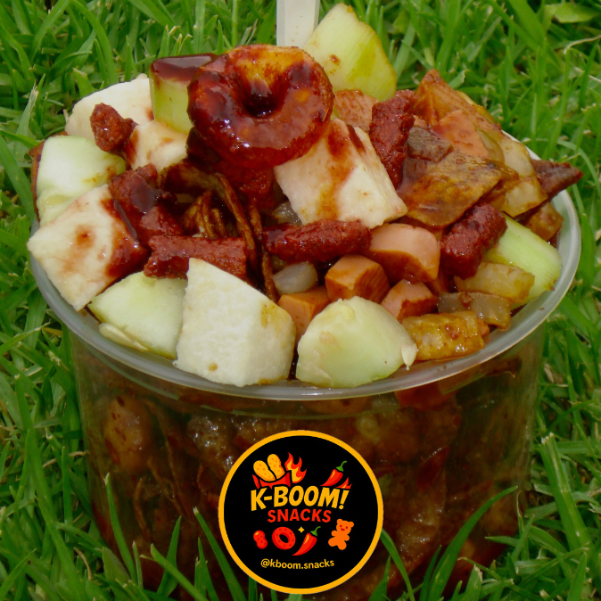 Pepino, jícama, cacahuates, rielitos, clamato y chamoy K-Boom