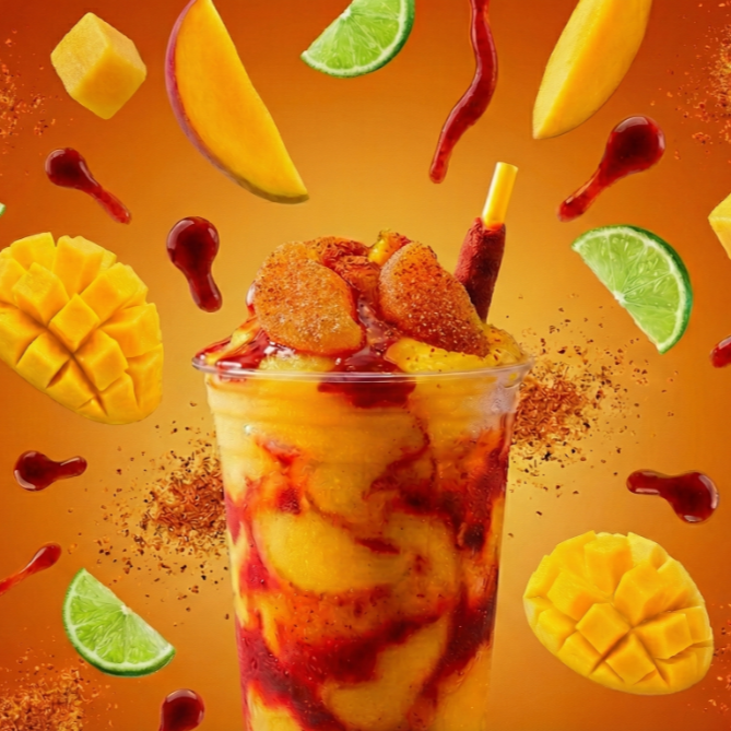 Smoothie de mango con ese toque irresistible de chamoy y chile, acompañado de gomitas y una banderilla que lo hace aún más antojable.