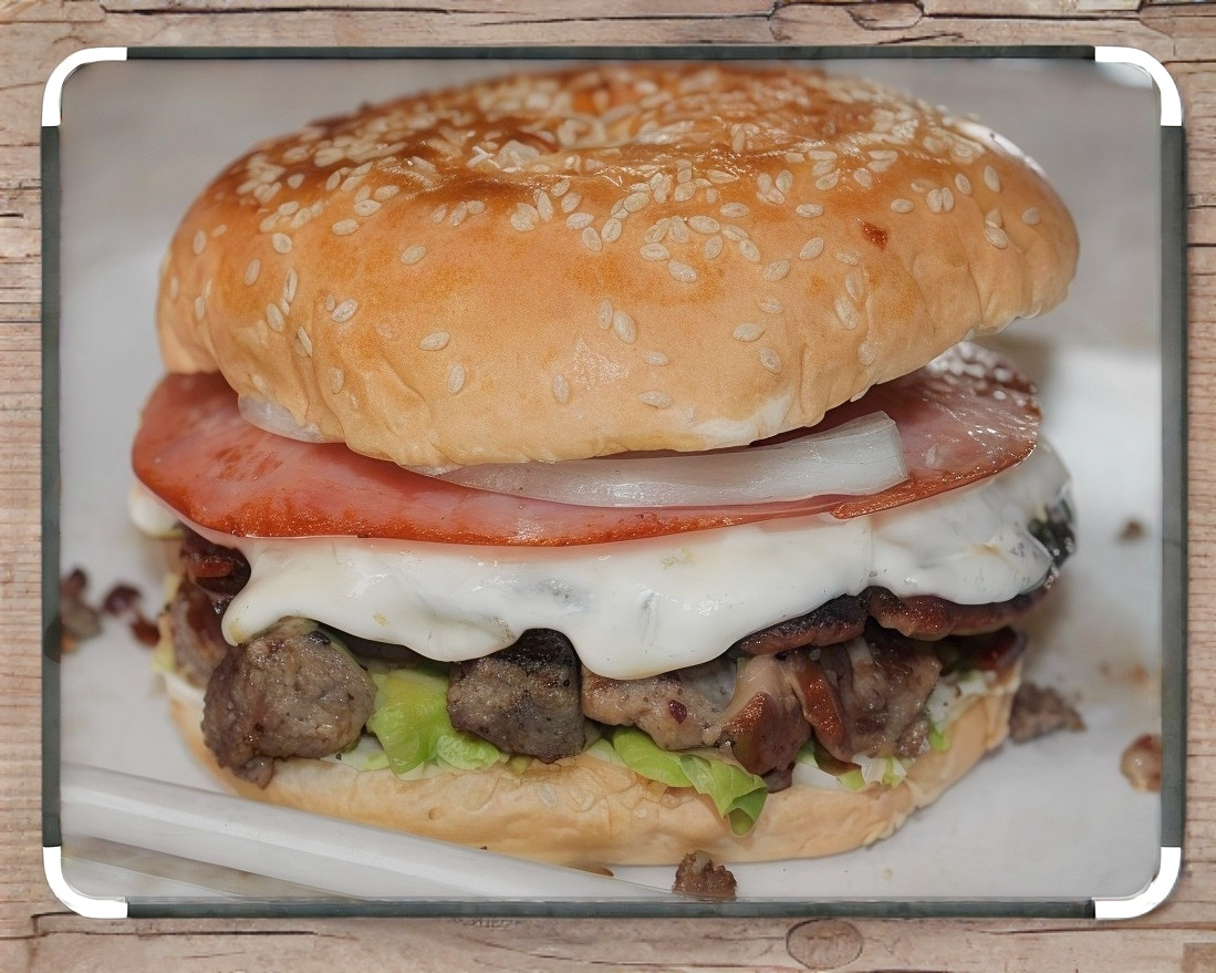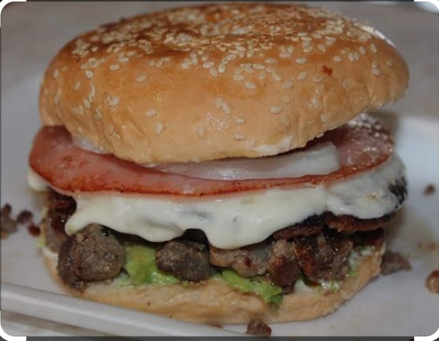 Carne de hambuerguesa, queso, jamon y tocino